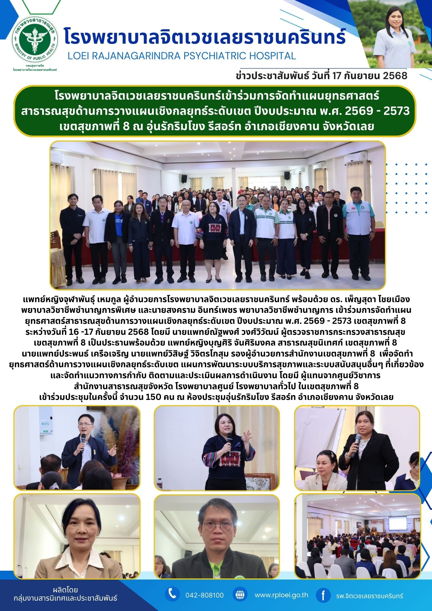 แพทย์หญิงจุฬาพันธ์ุ เหมกูล ผู้อำนวยการโรงพยาบาลจิตเวชเลยราชนครินทร์ พร้อมด้วย ดร. เพ็ญสุดา ไชยเมือง พยาบาลวิชาชีพชำนาญการพิเศษ และนายสงคราม อินทร์เพชร พยาบาลวิชาชีพชำนาญการ เข้าร่วมการจัดทำแผนยุทธศาสตร์สาธารณสุขด้านการวางแผนเชิงกลยุทธ์ระดับเขต ปีงบประมาณ พ.ศ. 2569 – 2573 เขตสุขภาพที่ 8 ระหว่างวันที่ 16 -17 กันยายน 2568 โดยมี นายแพทย์ณัฐพงศ์ วงศ์วิวัฒน์ ผู้ตรวจราชการกระทรวงสาธารณสุข เขตสุขภาพที่ 8 เป็นประธานพร้อมด้วย แพทย์หญิงบุญศิริ จันศิริมงคล สาธารณสุขนิเทศก์ เขตสุขภาพที่ 8 นายแพทย์ประพนธ์ เครือเจริญ นายแพทย์วิสิษฐ์ วิจิตรโกสุม รองผู้อำนวยการสำนักงานเขตสุขภาพที่ 8 เพื่อจัดทำยุทธศาสตร์ด้านการวางแผนเชิงกลยุทธ์ระดับเขต แผนการพัฒนาระบบบริการสุขภาพและระบบสนับสนุนอื่นๆ ที่เกี่ยวข้อง และจัดทำแนวทางการกำกับ ติดตามและประเมินผลการดำเนินงาน โดยมี ผู้แทนจากศูนย์วิชาการ สำนักงานสาธารณสุขจังหวัด โรงพยาบาลศูนย์ โรงพยาบาลทั่วไป ในเขตสุขภาพที่ 8 เข้าร่วมประชุมในครั้งนี้ จำนวน 150 คน ณ ห้องประชุมอุ่นรักริมโขง รีสอร์ท อำเภอเชียงคาน จังหวัดเลย