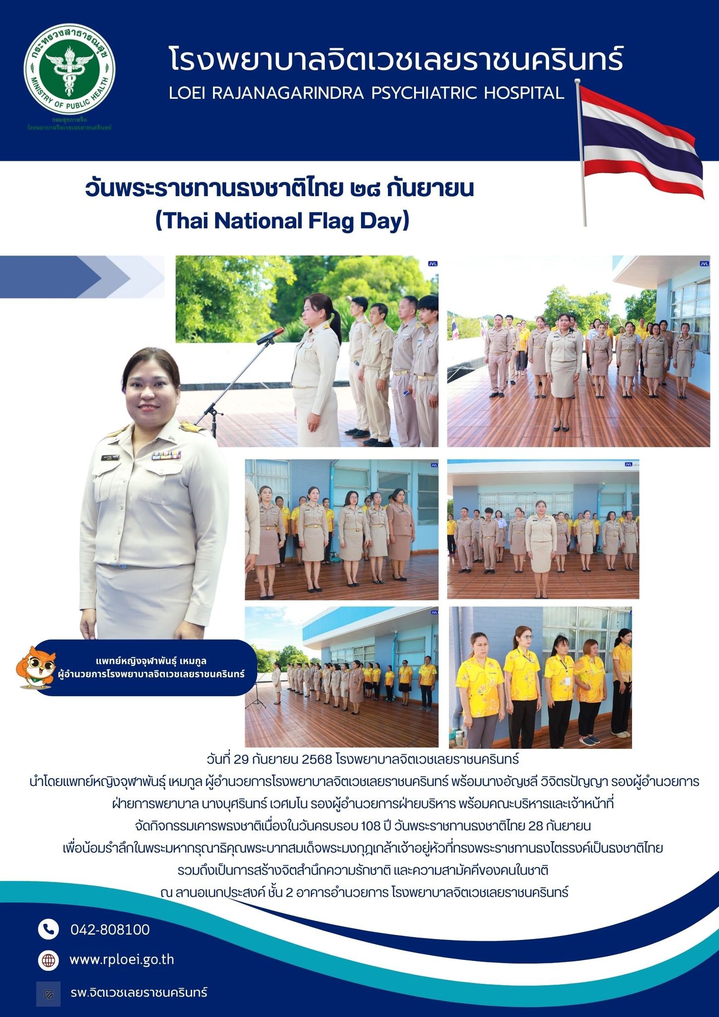 วันที่ 29 กันยายน 2568 โรงพยาบาลจิตเวชเลยราชนครินทร์ นำโดยแพทย์หญิงจุฬาพันธุ์ เหมกูล ผู้อำนวยการโรงพยาบาลจิตเวชเลยราชนครินทร์ พร้อมนางอัญชลี วิจิตรปัญญา รองผู้อำนวยการฝ่ายการพยาบาล นางบุศรินทร์ เวศมโน รองผู้อำนวยการฝ่ายบริหาร พร้อมคณะบริหารและเจ้าหน้าที่ จัดกิจกรรมเคารพธงชาติเนื่องในวันครบรอบ 108 ปี วันพระราชทานธงชาติไทย 28 กันยายน เพื่อน้อมรำลึกในพระมหากรุณาธิคุณพระบาทสมเด็จพระมงกุฎเกล้าเจ้าอยู่หัวที่ทรงพระราชทานธงไตรรงค์เป็นธงชาติไทย รวมถึงเป็นการสร้างจิตสำนึกความรักชาติ และความสามัคคีของคนในชาติ ณ ลานอเนกประสงค์ ชั้น 2 อาคารอำนวยการ โรงพยาบาลจิตเวชเลยราชนครินทร์