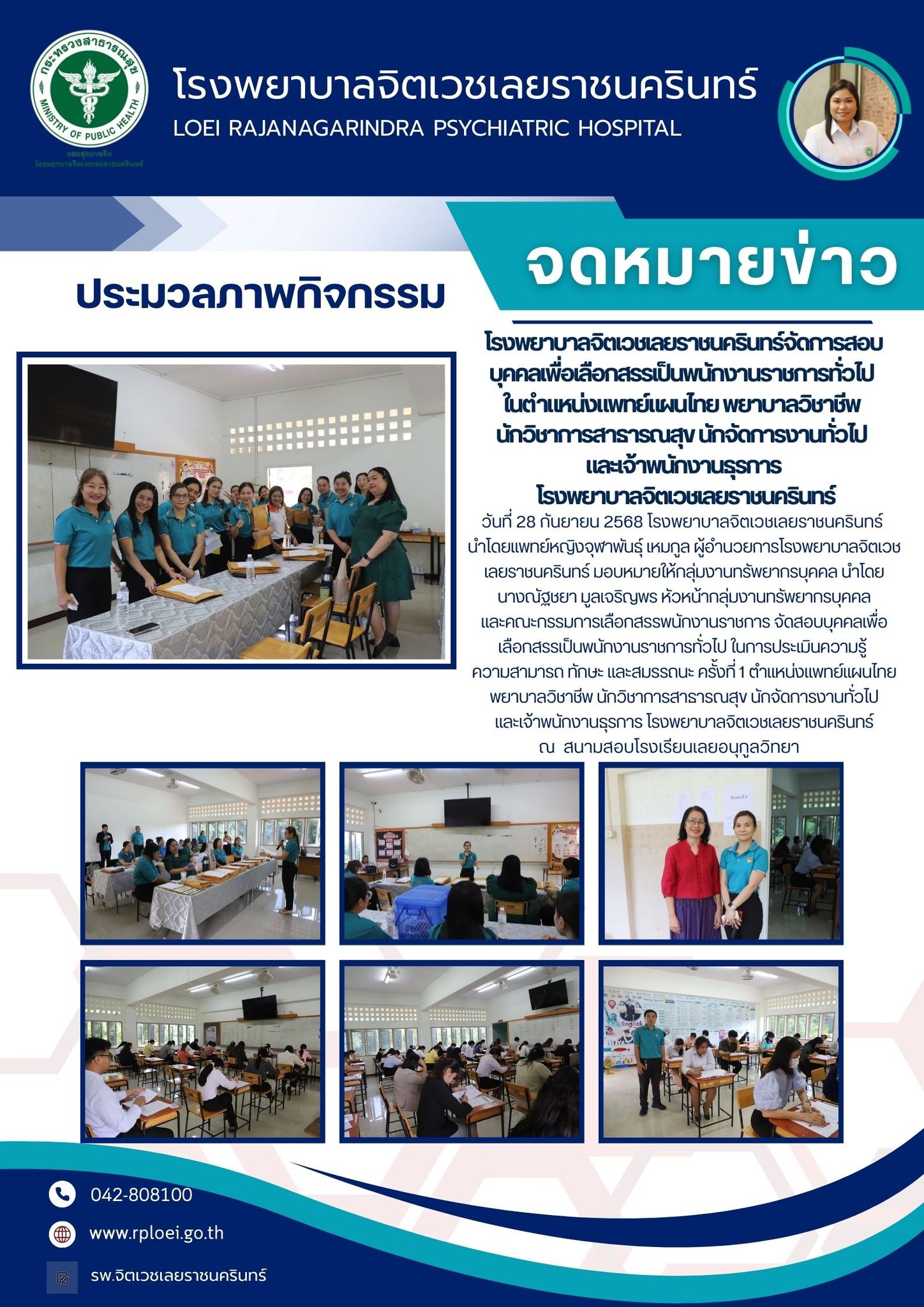 วันที่ 28 กันยายน 2568 โรงพยาบาลจิตเวชเลยราชนครินทร์นำโดยแพทย์หญิงจุฬาพันธุ์ เหมกูล ผู้อำนวยการโรงพยาบาลจิตเวชเลยราชนครินทร์ มอบหมายให้กลุ่มงานทรัพยากรบุคคล นำโดย นางณัฐชยา มูลเจริญพร หัวหน้ากลุ่มงานทรัพยากรบุคคลและคณะกรรมการเลือกสรรพนักงานราชการ จัดสอบบุคคลเพื่อเลือกสรรเป็นพนักงานราชการทั่วไป ในการประเมินความรู้ ความสามารถ ทักษะ และสมรรถนะ ครั้งที่ 1 ตำแหน่งแพทย์แผนไทย พยาบาลวิชาชีพ นักวิชาการสาธารณสุข นักจัดการงานทั่วไปและเจ้าพนักงานธุรการ โรงพยาบาลจิตเวชเลยราชนครินทร์ ณ สนามสอบโรงเรียนเลยอนุกูลวิทยา
