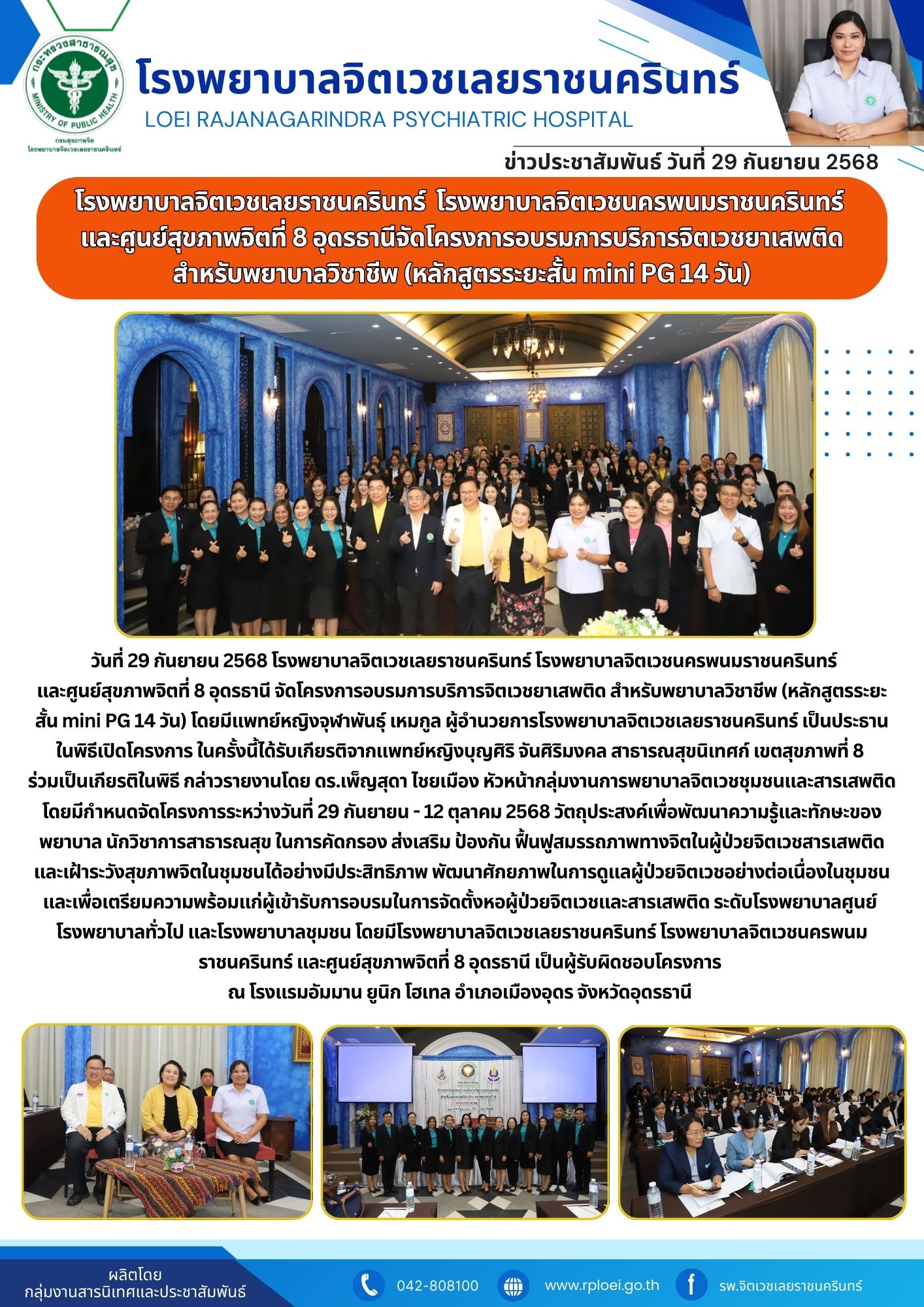 วันที่ 29 กันยายน 2568 โรงพยาบาลจิตเวชเลยราชนครินทร์ โรงพยาบาลจิตเวชนครพนมราชนครินทร์ และศูนย์สุขภาพจิตที่ 8 อุดรธานี จัดโครงการอบรมการบริการจิตเวชยาเสพติด สำหรับพยาบาลวิชาชีพ (หลักสูตรระยะสั้น mini PG 14 วัน) โดยมีแพทย์หญิงจุฬาพันธุ์ เหมกูล ผู้อำนวยการโรงพยาบาลจิตเวชเลยราชนครินทร์ เป็นประธานในพิธีเปิดโครงการ ในครั้งนี้ได้รับเกียรติจากแพทย์หญิงบุญศิริ จันศิริมงคล สาธารณสุขนิเทศก์ เขตสุขภาพที่ 8 ร่วมเป็นเกียรติในพิธี กล่าวรายงานโดย ดร.เพ็ญสุดา ไชยเมือง หัวหน้ากลุ่มงานการพยาบาลจิตเวชชุมชนและสารเสพติด โดยมีกำหนดจัดโครงการระหว่างวันที่ 29 กันยายน – 12 ตุลาคม 2568 วัตถุประสงค์เพื่อพัฒนาความรู้และทักษะของพยาบาล นักวิชาการสาธารณสุข ในการคัดกรอง ส่งเสริม ป้องกัน ฟื้นฟูสมรรถภาพทางจิตในผู้ป่วยจิตเวชสารเสพติดและเฝ้าระวังสุขภาพจิตในชุมชนได้อย่างมีประสิทธิภาพ พัฒนาศักยภาพในการดูแลผู้ป่วยจิตเวชอย่างต่อเนื่องในชุมชน และเพื่อเตรียมความพร้อมแก่ผู้เข้ารับการอบรมในการจัดตั้งหอผู้ป่วยจิตเวชและสารเสพติด ระดับโรงพยาบาลศูนย์ โรงพยาบาลทั่วไป และโรงพยาบาลชุมชน โดยมีโรงพยาบาลจิตเวชเลยราชนครินทร์ โรงพยาบาลจิตเวชนครพนมราชนครินทร์ และศูนย์สุขภาพจิตที่ 8 อุดรธานี เป็นผู้รับผิดชอบโครงการ ณ โรงแรมอัมมาน ยูนิก โฮเทล อำเภอเมืองอุดร จังหวัดอุดรธานี