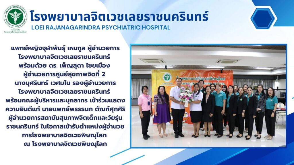 แพทย์หญิงจุฬาพันธ์ุ เหมกูล ผู้อำนวยการโรงพยาบาลจิตเวชเลยราชนครินทร์ พร้อมด้วย ดร. เพ็ญสุดา ไชยเมือง ผู้อำนวยการศูนย์สุขภาพจิตที่ 2 นางบุศรินทร์ เวศมโน รองผู้อำนวยการโรงพยาบาลจิตเวชเลยราชนครินทร์ พร้อมคณะผู้บริหารและบุคลากร เข้าร่วมแสดงความยินดีแก่ นายแพทย์พรรธนภ ตัณฑ์ศุภศิริ ผู้อำนวยการสถาบันสุขภาพจิตเด็กและวัยรุ่นราชนครินทร์ ในโอกาสเข้ารับตำแหน่งผู้อำนวยการโรงพยาบาลจิตเวชพิษณุโลก ณ โรงพยาบาลจิตเวช ษณุโลก