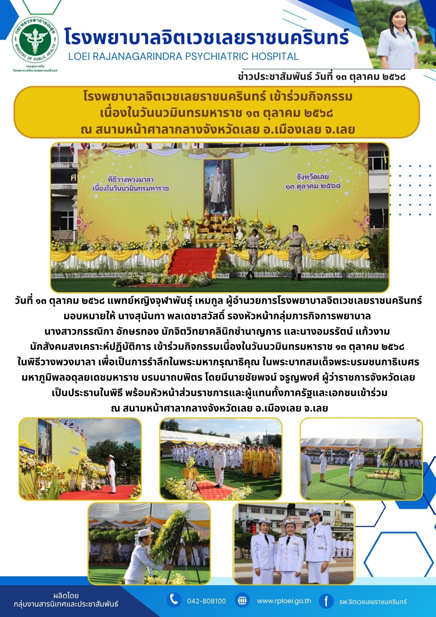 วันที่ ๑๓ ตุลาคม ๒๕๖๘ แพทย์หญิงจุฬาพันธุ์ เหมกูล ผู้อำนวยการโรงพยาบาลจิตเวชเลยราชนครินทร์ มอบหมายให้ นางสุนันทา พลเดชาสวัสดิ์ รองหัวหน้ากลุ่มภารกิจการพยาบาล นางสาวกรรณิกา อักษรทอง นักจิตวิทยาคลินิกชำนาญการ และนางอมรรัตน์ แก้วงาม นักสังคมสงเคราะห์ปฏิบัติการ เข้าร่วมกิจกรรมเนื่องในวันนวมินทรมหาราช ๑๓ ตุลาคม ๒๕๖๘ ในพิธีวางพวงมาลา เพื่อเป็นการรำลึกในพระมหากรุณาธิคุณ ในพระบาทสมเด็จพระบรมชนกาธิเบศร มหาภูมิพลอดุลยเดชมหาราช บรมนาถบพิตร โดยมีนายชัยพจน์ จรูญพงศ์ ผู้ว่าราชการจังหวัดเลยเป็นประธานในพิธี พร้อมหัวหน้าส่วนราชการและผู้แทนทั้งภาครัฐและเอกชนเข้าร่วมณ สนามหน้าศาลากลางจังหวัดเลย อ.เมืองเลย จ.เลย