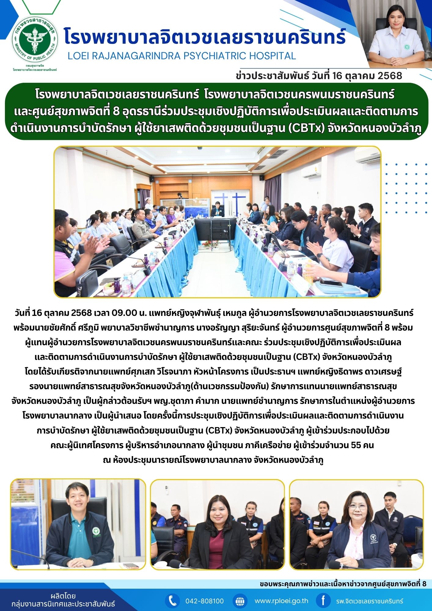 วันที่ 16 ตุลาคม 2568 เวลา 09.00 น. แพทย์หญิงจุฬาพันธุ์ เหมกูล ผู้อำนวยการโรงพยาบาลจิตเวชเลยราชนครินทร์ พร้อมนายชัยศักดิ์ ศรีภูมิ พยาบาลวิชาชีพชำนาญการ นางอรัญญา สุริยะจันทร์ ผู้อำนวยการศูนย์สุขภาพจิตที่ 8 พร้อม ผู้แทนผู้อำนวยการโรงพยาบาลจิตเวชนครพนมราชนครินทร์และคณะ ร่วมประชุมเชิงปฏิบัติการเพื่อประเมินผลและติดตามการดำเนินงานการบำบัดรักษา ผู้ใช้ยาเสพติดด้วยชุมชนเป็นฐาน (CBTx) จังหวัดหนองบัวลำภู โดยได้รับเกียรติจากนายแพทย์ศุภเสก วิโรจนาภา หัวหน้าโครงการ เป็นประธานฯ แพทย์หญิงธิดาพร ดาวเศรษฐ์ รองนายแพทย์สาธารณสุขจังหวัดหนองบัวลำภู(ด้านเวชกรรมป้องกัน) รักษาการแทนนายแพทย์สาธารณสุขจังหวัดหนองบัวลำภู เป็นผู้กล่าวต้อนรับฯ พญ.ชุดาภา คำมาก นายแพทย์ชำนาญการ รักษาการในตำแหน่งผู้อำนวยการโรงพยาบาลนากลาง เป็นผู้นำเสนอ โดยครั้งนี้การประชุมเชิงปฏิบัติการเพื่อประเมินผลและติดตามการดำเนินงานการบำบัดรักษา ผู้ใช้ยาเสพติดด้วยชุมชนเป็นฐาน (CBTx) จังหวัดหนองบัวลำภู ผู้เข้าร่วมประกอบไปด้วยคณะผู้นิเทศโครงการ ผู้บริหารอำเภอนากลาง ผู้นำชุมชน ภาคีเครือข่าย ผู้เข้าร่วมจำนวน 55 คน ณ ห้องประชุมนารายณ์โรงพยาบาลนากลาง จังหวัดหนองบัวลำภู ขอบพระคุณภาพข่าวและเนื้อหาข่าวจากศูนย์สุขภาพจิตที่ 8