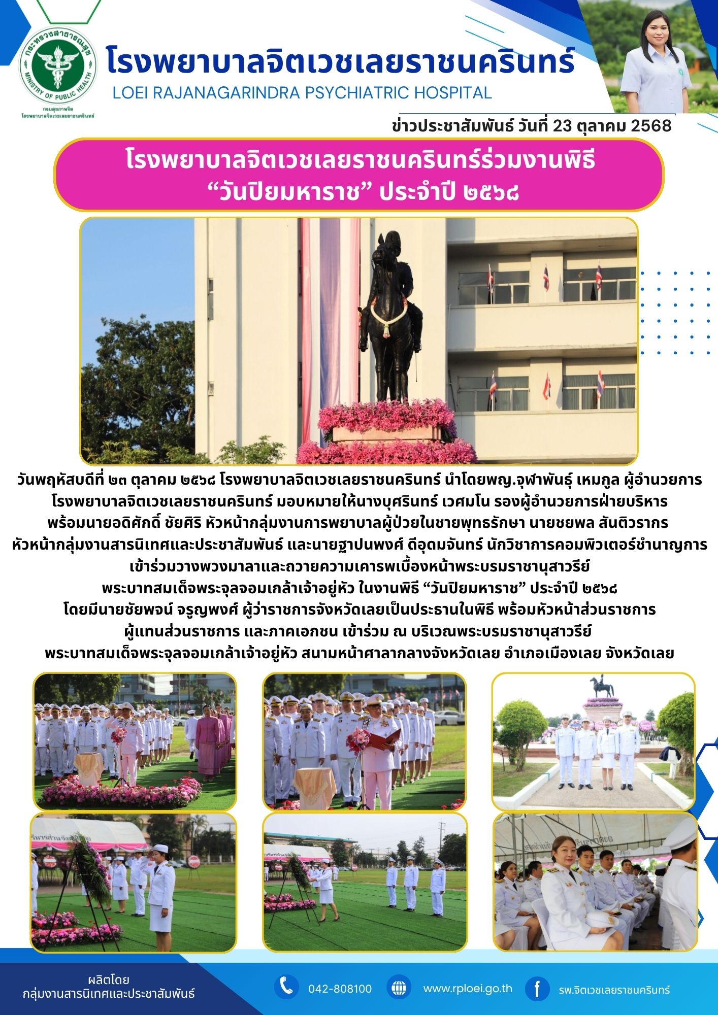 วันพฤหัสบดีที่ ๒๓ ตุลาคม ๒๕๖๘ โรงพยาบาลจิตเวชเลยราชนครินทร์ นำโดยพญ.จุฬาพันธุ์ เหมกูล ผู้อำนวยการโรงพยาบาลจิตเวชเลยราชนครินทร์ มอบหมายให้นางบุศรินทร์ เวศมโน รองผู้อำนวยการฝ่ายบริหารพร้อมนายอดิศักดิ์ ชัยศิริ หัวหน้ากลุ่มงานการพยาบาลผู้ป่วยในชายพุทธรักษา นายชยพล สันติวรากร หัวหน้ากลุ่มงานสารนิเทศและประชาสัมพันธ์ และนายฐาปนพงศ์ ดีอุดมจันทร์ นักวิชาการคอมพิวเตอร์ชำนาญการ เข้าร่วมวางพวงมาลาและถวายความเคารพเบื้องหน้าพระบรมราชานุสาวรีย์ พระบาทสมเด็จพระจุลจอมเกล้าเจ้าอยู่หัว ในงานพิธี “วันปิยมหาราช” ประจำปี ๒๕๖๘ โดยมีนายชัยพจน์ จรูญพงศ์ ผู้ว่าราชการจังหวัดเลยเป็นประธานในพิธี พร้อมหัวหน้าส่วนราชการ ผู้แทนส่วนราชการ และภาคเอกชน เข้าร่วม ณ บริเวณพระบรมราชานุสาวรีย์ พระบาทสมเด็จพระจุลจอมเกล้าเจ้าอยู่หัว สนามหน้าศาลากลางจังหวัดเลย อำเภอเมืองเลย จังหวัดเลย