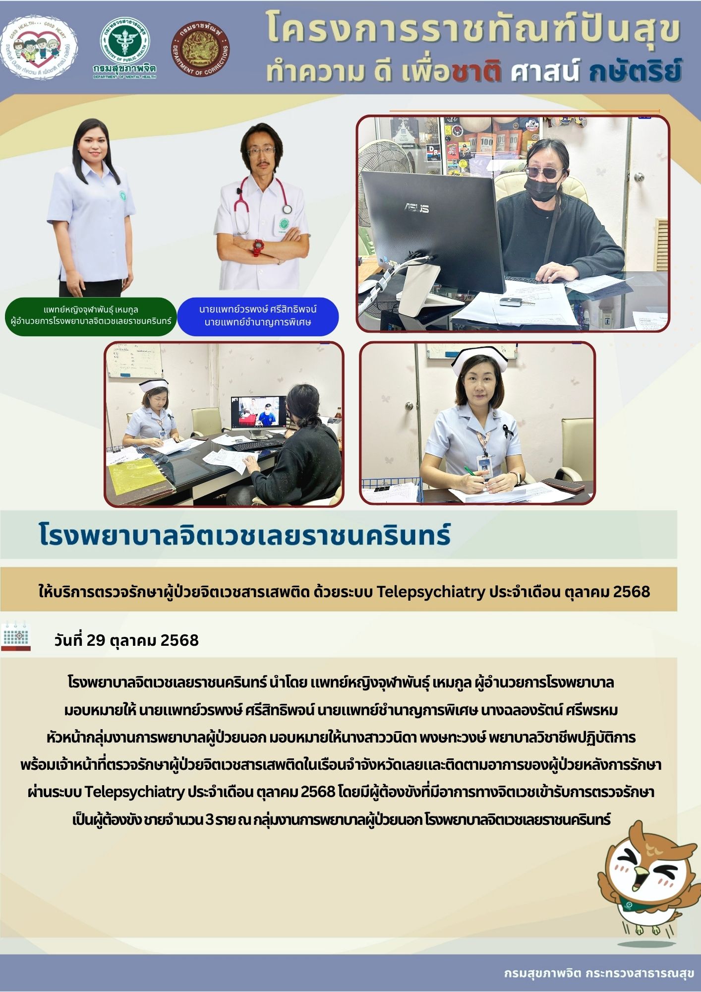 โรงพยาบาลจิตเวชเลยราชนครินทร์ นำโดย แพทย์หญิงจุฬาพันธุ์ เหมกูล ผู้อำนวยการโรงพยาบาล มอบหมายให้ นายแพทย์วรพงษ์ ศรีสิทธิพจน์ นายแพทย์ชำนาญการพิเศษ นางฉลองรัตน์ ศรีพรหม หัวหน้ากลุ่มงานการพยาบาลผู้ป่วยนอก มอบหมายให้นางสาววนิดา พงษทะวงษ์ พยาบาลวิชาชีพปฏิบัติการพร้อมเจ้าหน้าที่ตรวจรักษาผู้ป่วยจิตเวชสารเสพติดในเรือนจำจังหวัดเลยและติดตามอาการของผู้ป่วยหลังการรักษา ผ่านระบบ Telepsychiatry ประจำเดือน ตุลาคม 2568 โดยมีผู้ต้องขังที่มีอาการทางจิตเวชเข้ารับการตรวจรักษาเป็นผู้ต้องขัง ชายจำนวน 3 ราย ณ กลุ่มงานการพยาบาลผู้ป่วยนอก โรงพยาบาลจิตเวชเลยราชนครินทร์