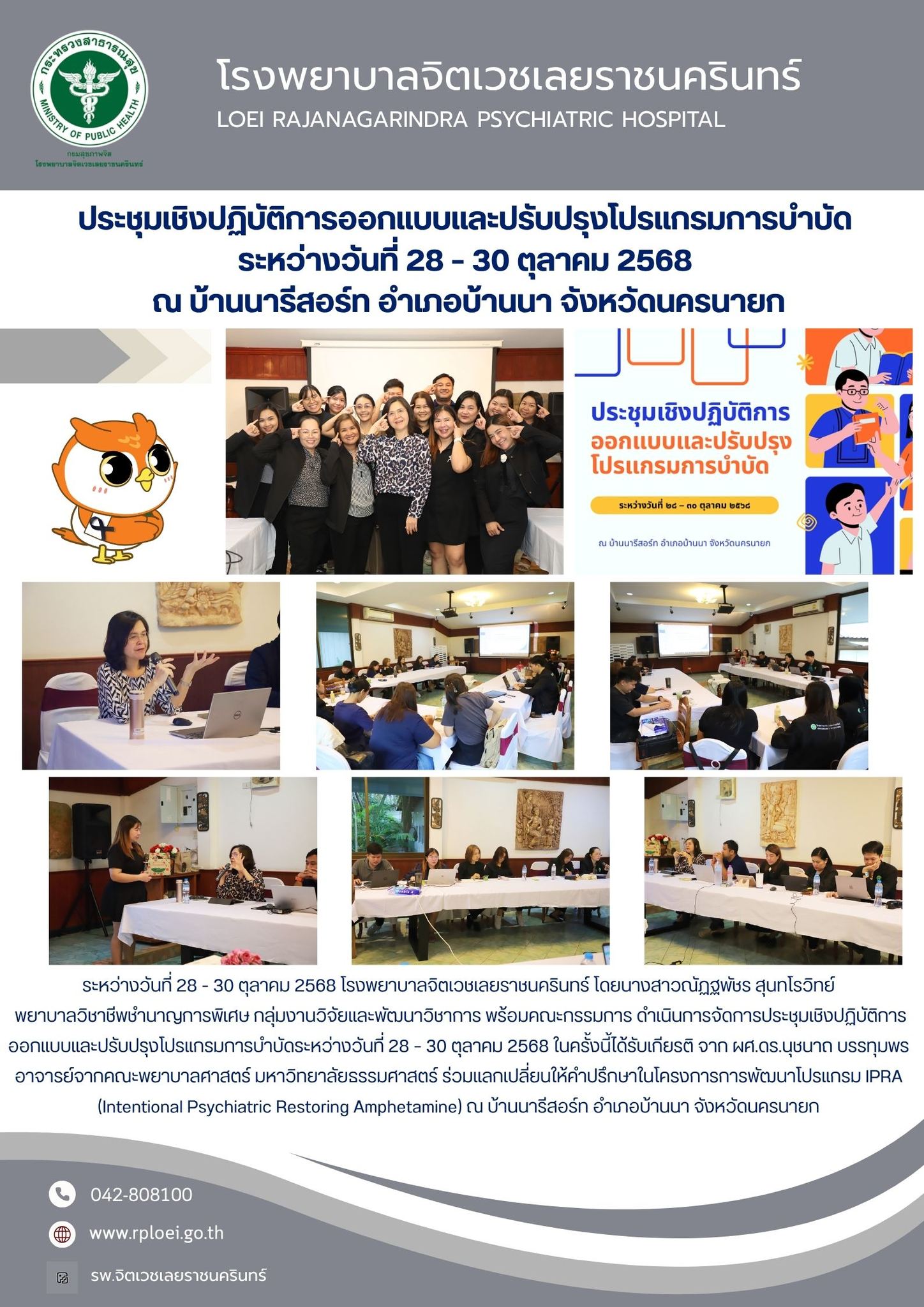 ระหว่างวันที่ 28 – 30 ตุลาคม 2568 โรงพยาบาลจิตเวชเลยราชนครินทร์ โดยนางสาวณัฏฐพัชร สุนทโรวิทย์ พยาบาลวิชาชีพชำนาญการพิเศษ กลุ่มงานวิจัยและพัฒนาวิชาการ พร้อมคณะกรรมการ ดำเนินการจัดการประชุมเชิงปฏิบัติการออกแบบและปรับปรุงโปรแกรมการบำบัดระหว่างวันที่ 28 – 30 ตุลาคม 2568 ในครั้งนี้ได้รับเกียรติ จาก ผศ.ดร.นุชนาถ บรรทุมพร อาจารย์จากคณะพยาบาลศาสตร์ มหาวิทยาลัยธรรมศาสตร์ ร่วมแลกเปลี่ยนให้คำปรึกษาในโครงการการพัฒนาโปรแกรม IPRA (Intentional Psychiatric Restoring Amphetamine) ณ บ้านนารีสอร์ท อำเภอบ้านนา จังหวัดนครนายก