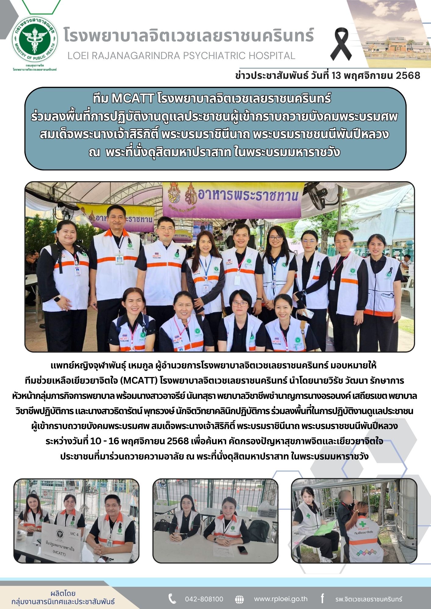 แพทย์หญิงจุฬาพันธุ์ เหมกูล ผู้อำนวยการโรงพยาบาลจิตเวชเลยราชนครินทร์ มอบหมายให้ ทีมช่วยเหลือเยียวยาจิตใจ (MCATT) โรงพยาบาลจิตเวชเลยราชนครินทร์ นำโดยนายวิรัช วัฒนา รักษาการหัวหน้ากลุ่มภารกิจการพยาบาล พร้อมนางสาวอาจรีย์ นันทสุธา พยาบาลวิชาชีพชำนาญการ นางอรอนงค์ เสถียรเขต พยาบาลวิชาชีพปฏิบัติการ และนางสาวธิดารัตน์ พุทธวงษ์ นักจิตวิทยาคลินิกปฏิบัติการ ร่วมลงพื้นที่ในการปฏิบัติงานดูแลประชาชนผู้เข้ากราบถวายบังคมพระบรมศพ สมเด็จพระนางเจ้าสิริกิติ์ พระบรมราชินีนาถ พระบรมราชชนนีพันปีหลวง ระหว่างวันที่ 10 – 16 พฤศจิกายน 2568 เพื่อค้นหา คัดกรองปัญหาสุขภาพจิตและเยียวยาจิตใจ ประชาชนที่มาร่วนถวายความอาลัย ณ พระที่นั่งดุสิตมหาปราสาท ในพระบรมมหาราชวัง