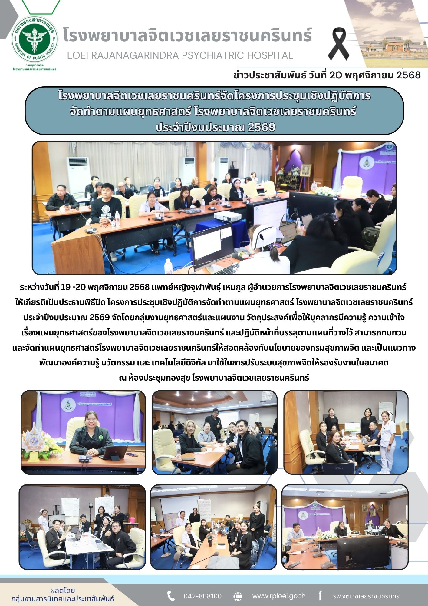 ระหว่างวันที่ 19 -20 พฤศจิกายน 2568 แพทย์หญิงจุฬาพันธุ์ เหมกูล ผู้อำนวยการโรงพยาบาลจิตเวชเลยราชนครินทร์ ให้เกียรติเป็นประธานพิธีเปิดโครงการประชุมเชิงปฏิบัติการจัดทำตามแผนยุทธศาสตร์ โรงพยาบาลจิตเวชเลยราชนครินทร์ ประจำปีงบประมาณ 2569 จัดโดยกลุ่มงานยุทธศาสตร์และแผนงาน วัตถุประสงค์เพื่อให้บุคลากรมีความรู้ ความเข้าใจ เรื่องแผนยุทธศาสตร์ของโรงพยาบาลจิตเวชเลยราชนครินทร์ และปฏิบัติหน้าที่บรรลุตามแผนที่วางไว้ สามารถทบทวนและจัดทำแผนยุทธศาสตร์โรงพยาบาลจิตเวชเลยราชนครินทร์ให้สอดคล้องกับนโยบายของกรมสุขภาพจิต และเป็นแนวทางพัฒนาองค์ความรู้ นวัตกรรม และ เทคโนโลยีดิจิทัล มาใช้ในการปรับระบบสุขภาพจิตให้รองรับงานในอนาคต ณ ห้องประชุมกองสุข โรงพยาบาลจิตเวชเลยราชนครินทร์