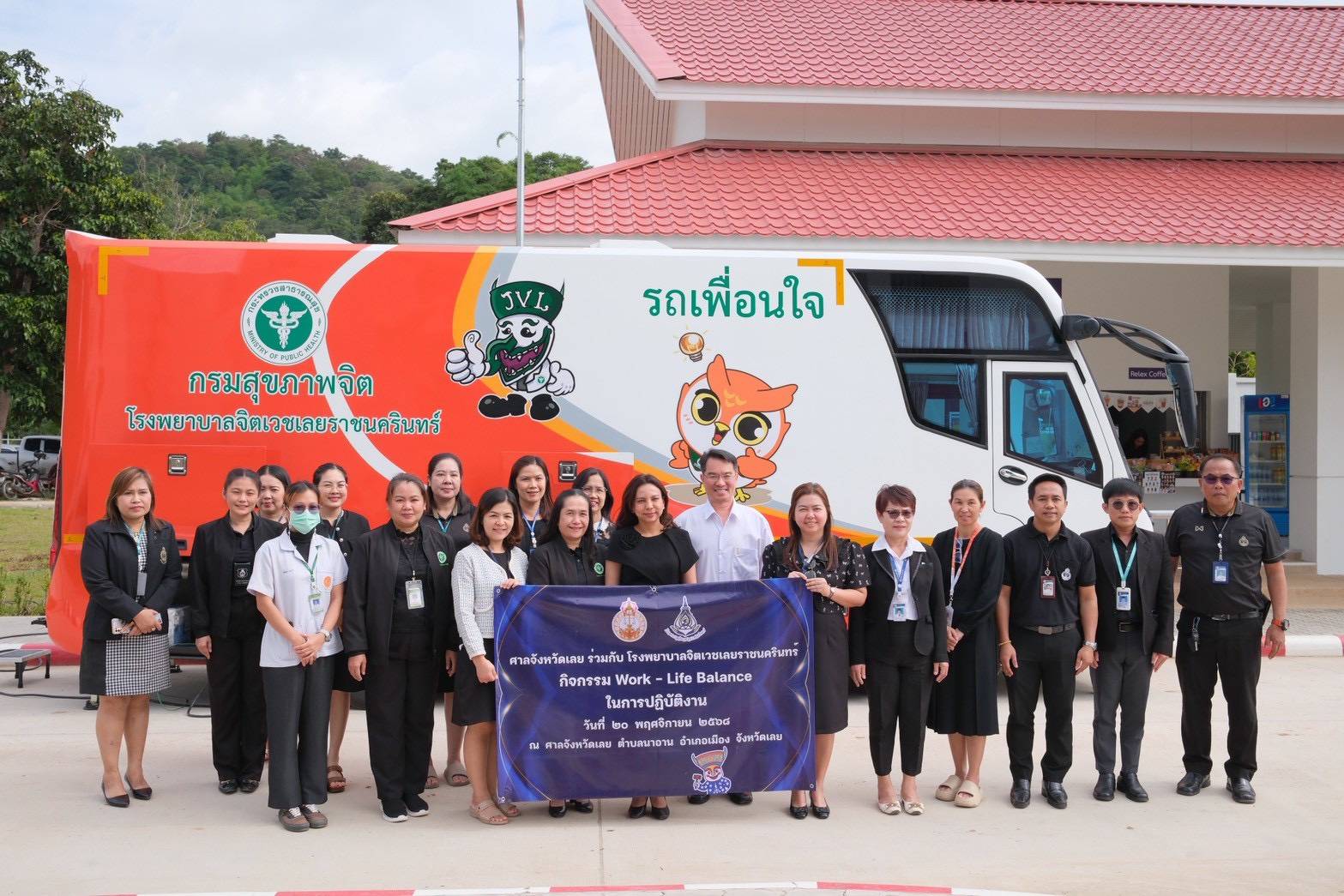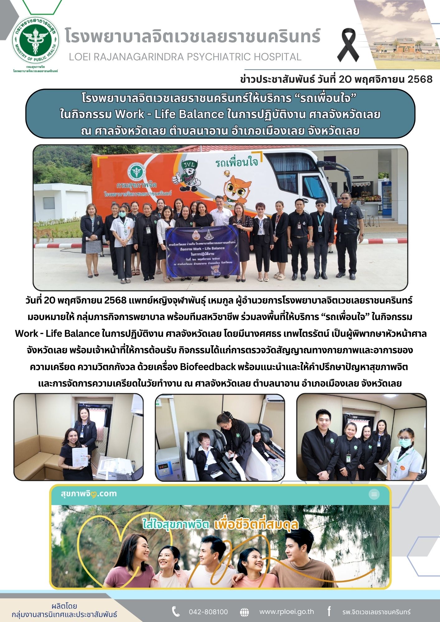 วันที่ 20 พฤศจิกายน 2568 แพทย์หญิงจุฬาพันธุ์ เหมกูล ผู้อำนวยการโรงพยาบาลจิตเวชเลยราชนครินทร์ มอบหมายให้ กลุ่มภารกิจการพยาบาล พร้อมทีมสหวิชาชีพ ร่วมลงพื้นที่ให้บริการ “รถเพื่อนใจ” ในกิจกรรม Work – Life Balance ในการปฏิบัติงาน ศาลจังหวัดเลย โดยมีนางศศธร เทพไตรรัตน์ เป็นผู้พิพากษาหัวหน้าศาลจังหวัดเลย พร้อมเจ้าหน้าที่ให้การต้อนรับ กิจกรรมได้แก่การตรวจวัดสัญญาณทางกายภาพและอาการของความเครียด ความวิตกกังวล ด้วยเครื่อง Biofeedback พร้อมแนะนำและให้คำปรึกษาปัญหาสุขภาพจิต และการจัดการความเครียดในวัยทำงาน ณ ศาลจังหวัดเลย ตำบลนาอาน อำเภอเมืองเลย จังหวัดเลย