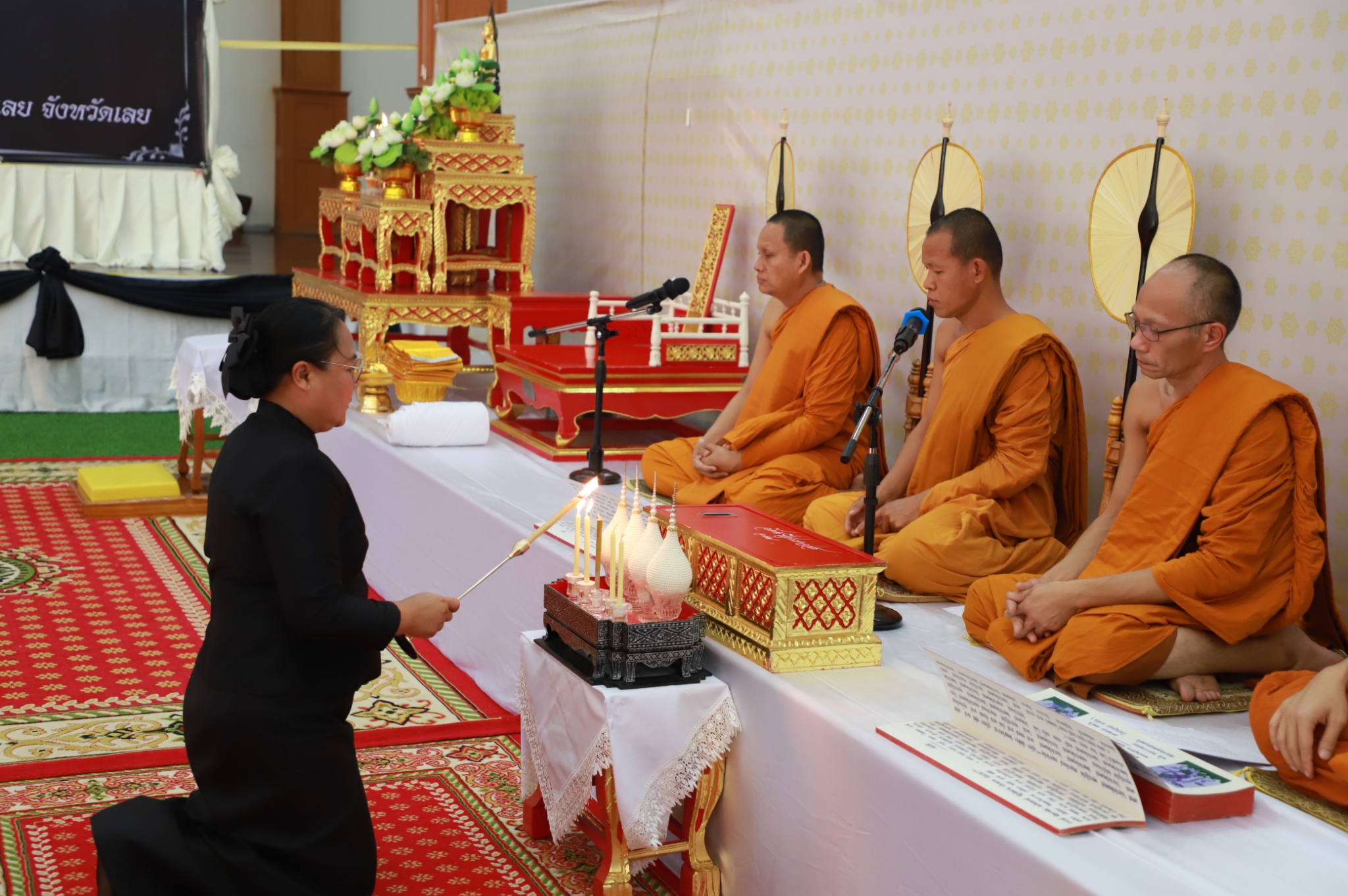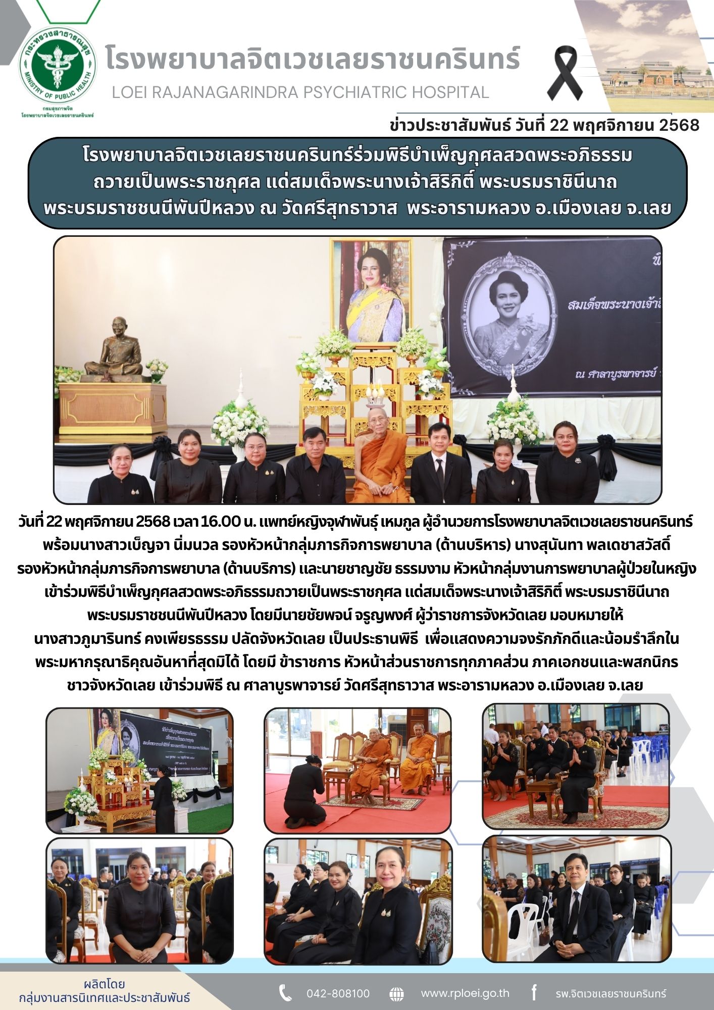 วันที่ 22 พฤศจิกายน 2568 เวลา 16.00 น. แพทย์หญิงจุฬาพันธุ์ เหมกูล ผู้อำนวยการโรงพยาบาลจิตเวชเลยราชนครินทร์ พร้อมนางสาวเบ็ญจา นิ่มนวล รองหัวหน้ากลุ่มภารกิจการพยาบาล (ด้านบริหาร) นางสุนันทา พลเดชาสวัสดิ์ รองหัวหน้ากลุ่มภารกิจการพยาบาล (ด้านบริการ) และนายชาญชัย ธรรมงาม หัวหน้ากลุ่มงานการพยาบาลผู้ป่วยในหญิง เข้าร่วมพิธีบำเพ็ญกุศลสวดพระอภิธรรมถวายเป็นพระราชกุศล แด่สมเด็จพระนางเจ้าสิริกิติ์ พระบรมราชินีนาถ พระบรมราชชนนีพันปีหลวง โดยมีนายชัยพจน์ จรูญพงศ์ ผู้ว่าราชการจังหวัดเลย มอบหมายให้ นางสาวภูมารินทร์ คงเพียรธรรม ปลัดจังหวัดเลย เป็นประธานพิธี เพื่อแสดงความจงรักภักดีและน้อมรำลึกใน พระมหากรุณาธิคุณอันหาที่สุดมิได้ โดยมี ข้าราชการ หัวหน้าส่วนราชการทุกภาคส่วน ภาคเอกชนและพสกนิกรชาวจังหวัดเลย เข้าร่วมพิธี ณ ศาลาบูรพาจารย์ วัดศรีสุทธาวาส พระอารามหลวง อ.เมืองเลย จ.เลย