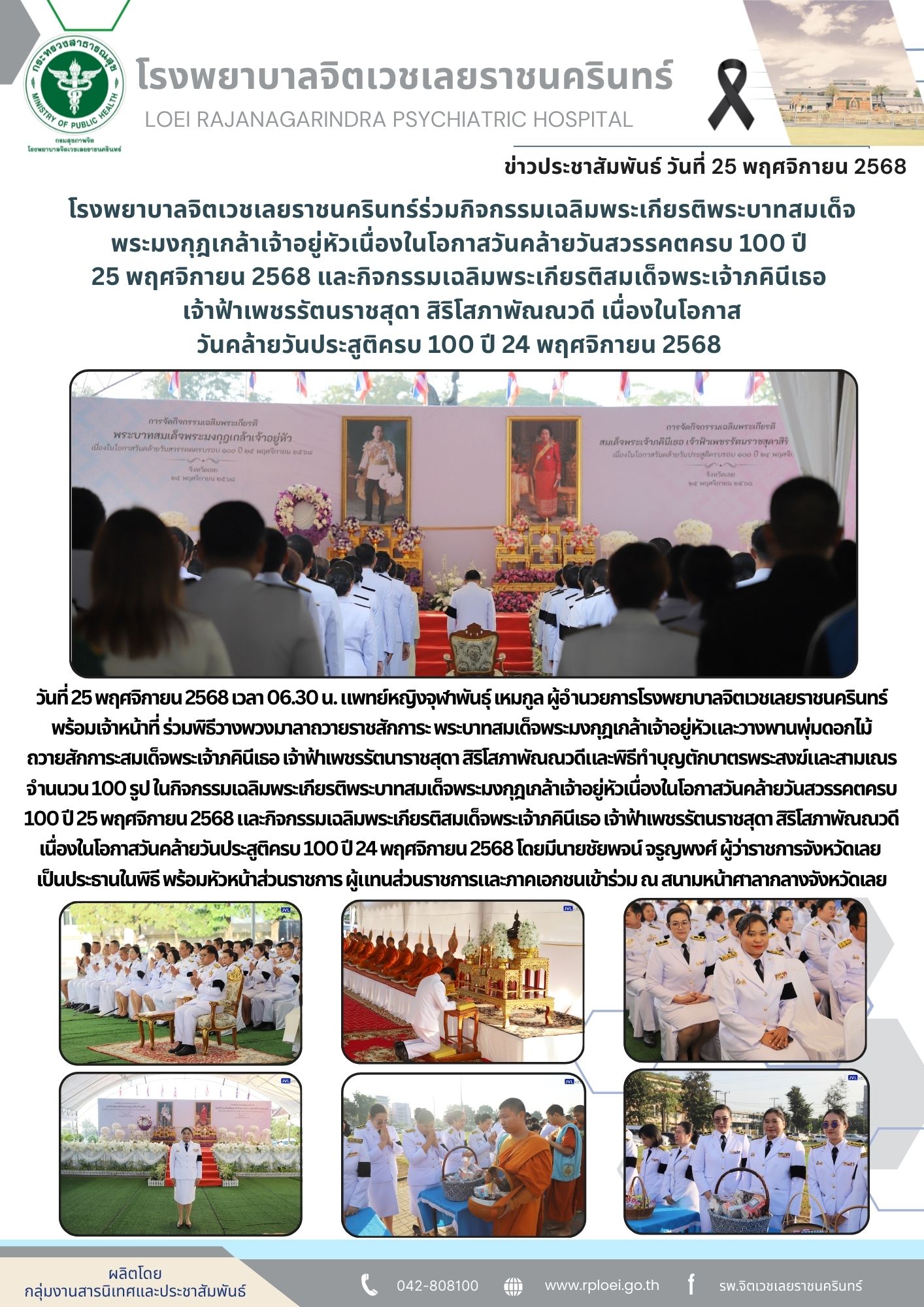วันที่ 25 พฤศจิกายน 2568 เวลา 06.30 น. แพทย์หญิงจุฬาพันธุ์ เหมกูล ผู้อำนวยการโรงพยาบาลจิตเวชเลยราชนครินทร์ พร้อมเจ้าหน้าที่ร่วมพิธีวางพวงมาลาถวายราชสักการะ พระบาทสมเด็จพระมงกุฎเกล้าเจ้าอยู่หัวและวางพานพุ่มดอกไม้ถวายสักการะสมเด็จพระเจ้าภคินีเธอ เจ้าฟ้าเพชรรัตนาราชสุดา สิริโสภาพัณณวดีและพิธีทำบุญตักบาตรพระสงฆ์และสามเณร จำนนวน 100 รูป ในกิจกรรมเฉลิมพระเกียรติพระบาทสมเด็จพระมงกุฎเกล้าเจ้าอยู่หัวเนื่องในโอกาสวันคล้ายวันสวรรคตครบ 100 ปี 25 พฤศจิกายน 2568 และกิจกรรมเฉลิมพระเกียรติสมเด็จพระเจ้าภคินีเธอ เจ้าฟ้าเพชรรัตนราชสุดา สิริโสภาพัณณวดี เนื่องในโอกาสวันคล้ายวันประสูติครบ 100 ปี 24 พฤศจิกายน 2568 โดยมีนายชัยพจน์ จรูญพงศ์ ผู้ว่าราชการจังหวัดเลย เป็นประธานในพิธี พร้อมหัวหน้าส่วนราชการ ผู้แทนส่วนราชการและภาคเอกชนเข้าร่วม ณ สนามหน้าศาลากลางจังหวัดเลย
