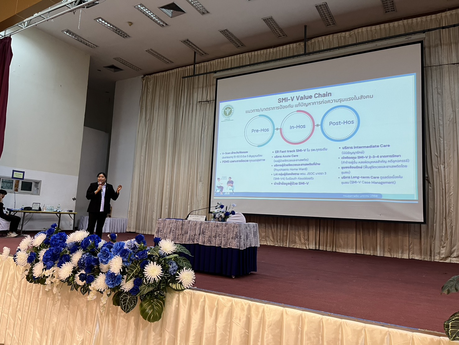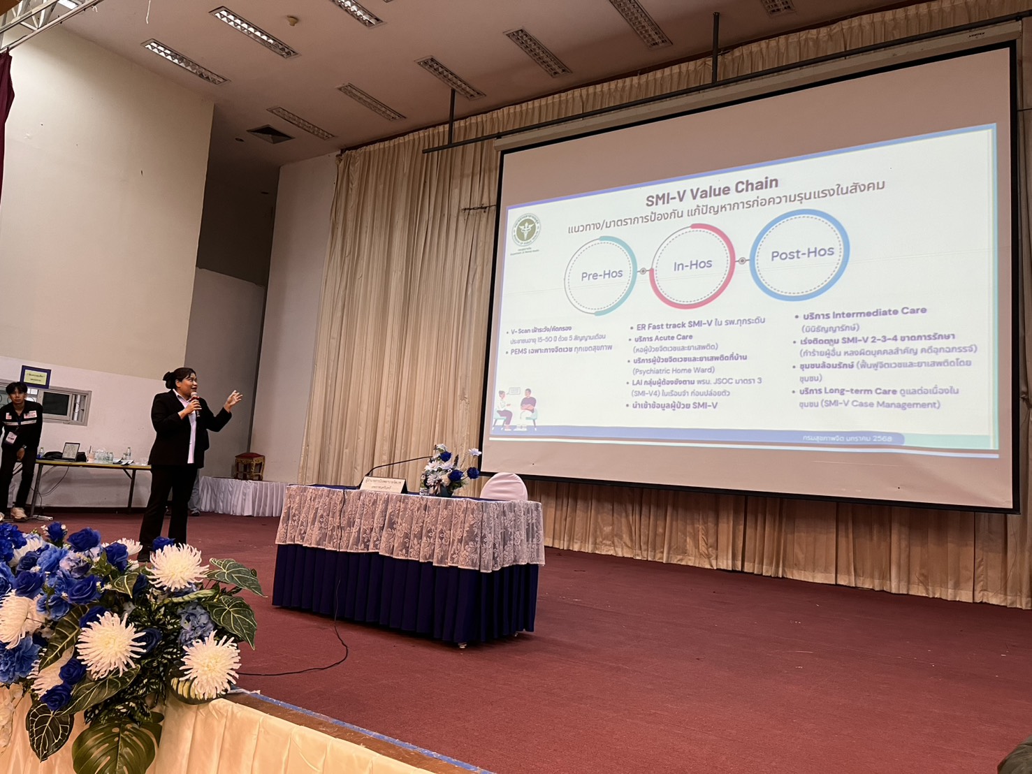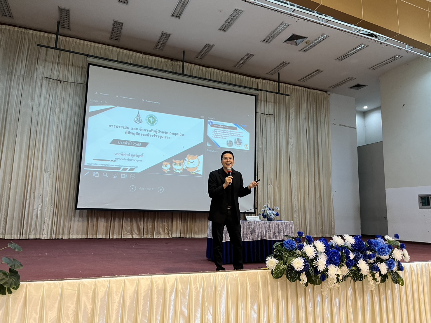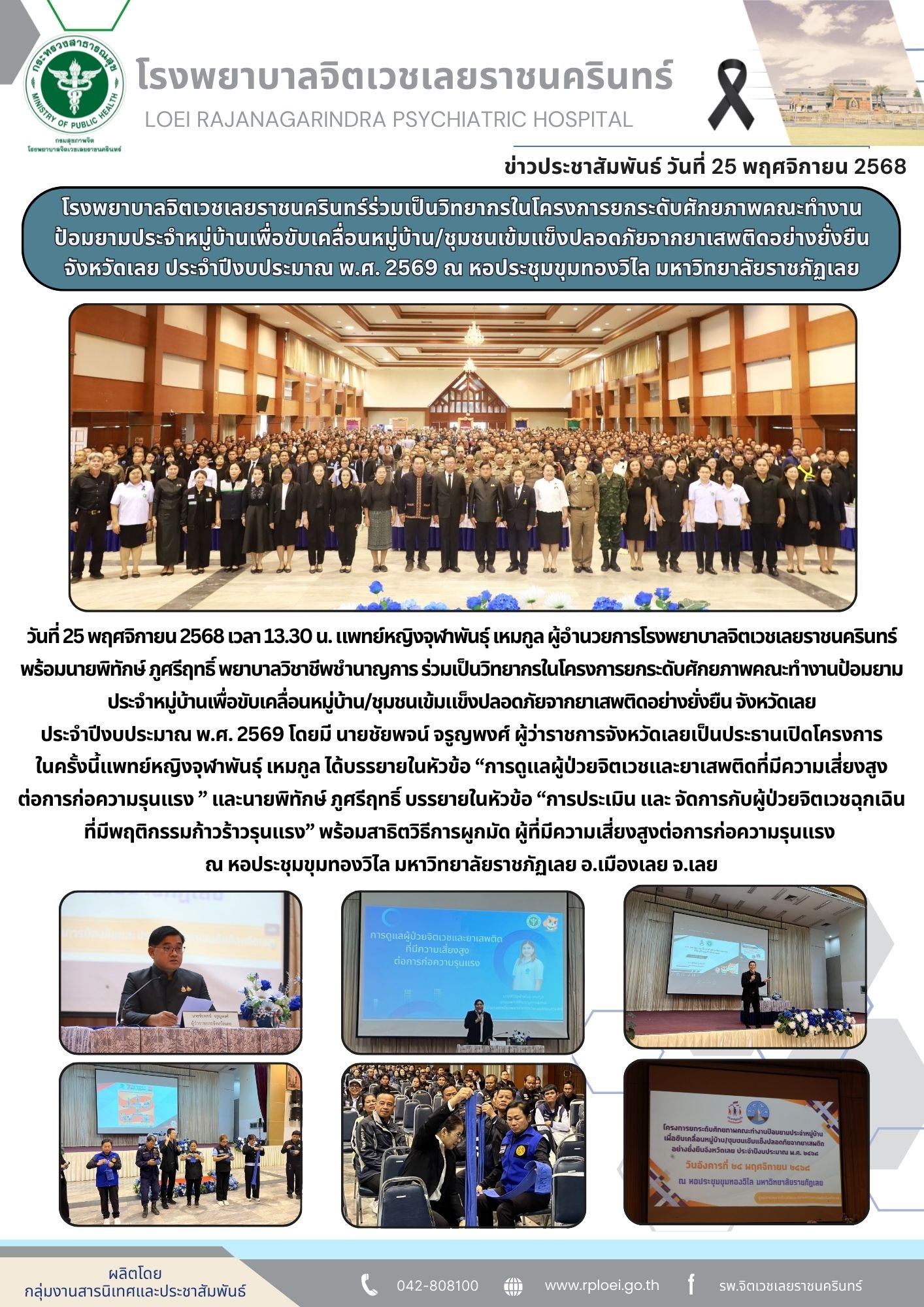 วันที่ 25 พฤศจิกายน 2568 เวลา 13.30 น. แพทย์หญิงจุฬาพันธุ์ เหมกูล ผู้อำนวยการโรงพยาบาลจิตเวชเลยราชนครินทร์ พร้อมนายพิทักษ์ ภูศรีฤทธิ์ พยาบาลวิชาชีพชำนาญการ ร่วมเป็นวิทยากรในโครงการยกระดับศักยภาพคณะทำงานป้อมยามประจำหมู่บ้านเพื่อขับเคลื่อนหมู่บ้าน/ชุมชนเข้มแข็งปลอดภัยจากยาเสพติดอย่างยั่งยืน จังหวัดเลยประจำปีงบประมาณ พ.ศ. 2569 โดยมี นายชัยพจน์ จรูญพงศ์ ผู้ว่าราชการจังหวัดเลยเป็นประธานเปิดโครงการในครั้งนี้แพทย์หญิงจุฬาพันธุ์ เหมกูล ได้บรรยายในหัวข้อ “การดูแลผู้ป่วยจิตเวชและยาเสพติดที่มีความเสี่ยงสูงต่อการก่อความรุนแรง ” และนายพิทักษ์ ภูศรีฤทธิ์ บรรยายในหัวข้อ “การประเมิน และ จัดการกับผู้ป่วยจิตเวชฉุกเฉินที่มีพฤติกรรมก้าวร้าวรุนแรง” พร้อมสาธิตวิธีการผูกมัด ผู้ที่มีความเสี่ยงสูงต่อการก่อความรุนแรง ณ หอประชุมขุมทองวิไล มหาวิทยาลัยราชภัฏเลย อ.เมืองเลย จ.เลย