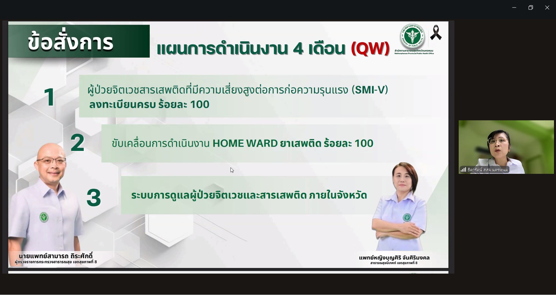 วันที่ 26 พฤศจิกายน 2568 เวลา 10.30 น. แพทย์หญิงจุฬาพันธุ์ เหมกูล ผู้อำนวยการโรงพยาบาลจิตเวชเลยราชนครินทร์ พร้อมนางสุนันทา พลเดชาสวัสดิ์ รองหัวหน้ากลุ่มภารกิจการพยาบาล (ด้านบริการ) และเจ้าหน้าที่ เข้าร่วมประชุมวางแผนการพัฒนาระบบรับ – ส่งต่อผู้ป่วยจิตเวชและ จิตเวชยาเสพติดแบบดิจิทัล เขตสุขภาพที่ 8 โดบมีแพทย์หญิงบุญศิริ จันศิริมงคล สาธารณสุขนิเทศก์ เขตสุขภาพที่ 8 เป็นประธานการประชุม พร้อมด้วย นายแพทย์กิตติเชษฐ์ ธีรกุลพงศ์เวช รองนายแพทย์สาธารณสุขจังหวัดนครพนม นายแพทย์วิสิษฐ์ วิจิตรโกสุม ผู้อำนวยการโรงพยาบาลธัญญารักษ์ อุดรธานี และผู้เกี่ยวข้องเข้าร่วมการประชุมเพื่อ ติดตามความก้าวหน้าการขับเคลื่อนนโยบาย Quick Very Win SMIV และระบบการดูแลผู้ป่วยจิตเวชและสารเสพติด ภายในจังหวัด (3s) อุดรธานี สกลนคร นครพนม เลย หนองคาย บึงกาฬ หนองบัวลำภู ตลอดจนแนวทางบริหารจัดการ การหารือ Up-Re Skill สำหรับผู้ปฏิบัติงานด้านยาเสพติด การส่งต่อเคส และตารางการนิเทศ ของโรงพยาบาลจิตเวช 100 โดยมีผู้เข้าร่วมประชุมผ่านระบบ Zoom Meeting จำนวน 67 User ขอบพระคุณภาพและเนื้อหาประกอบข่าวจากสำนักงานเขตสุขภาพที่ 8