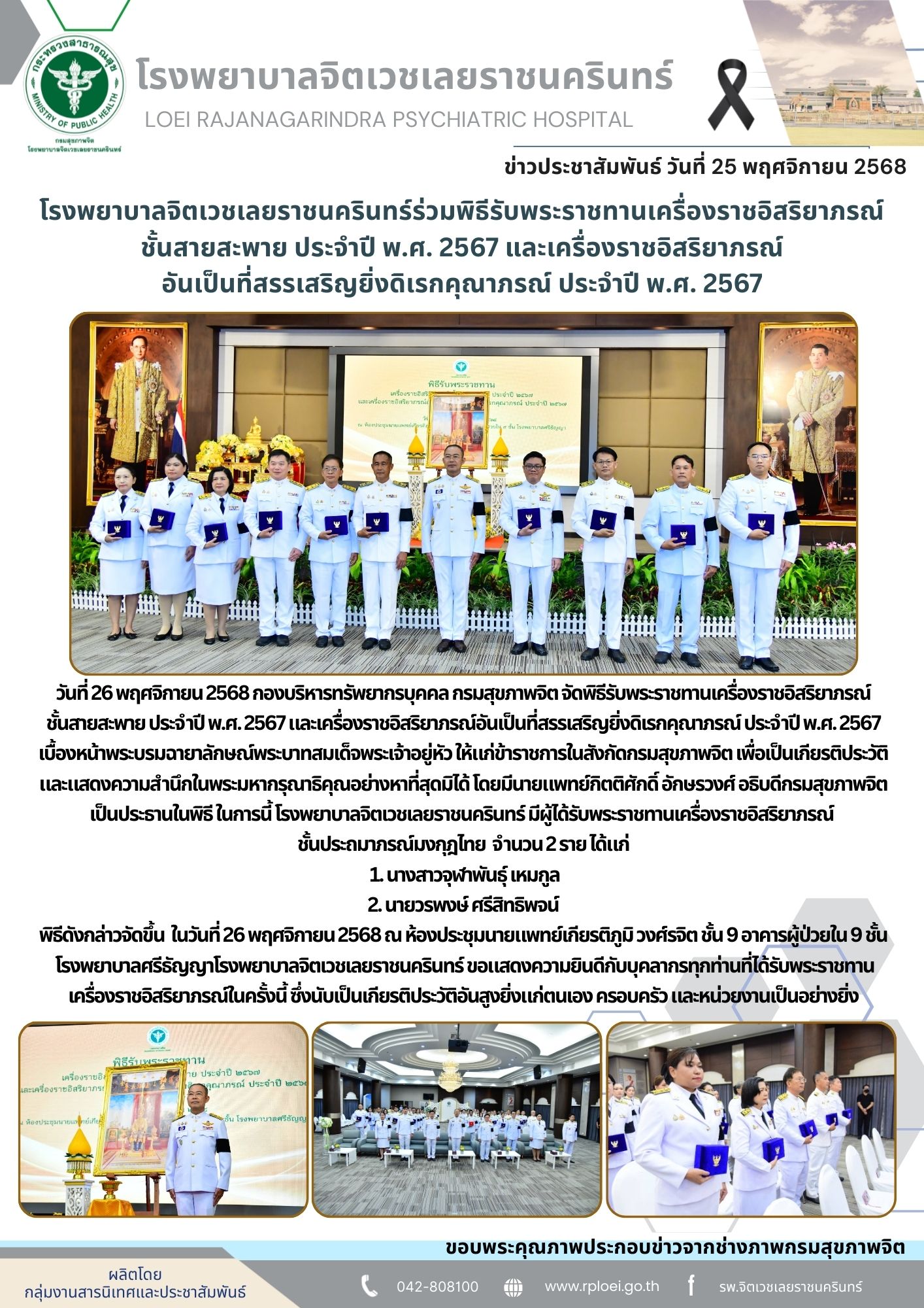 วันที่ 26 พฤศจิกายน 2568 กองบริหารทรัพยากรบุคคล กรมสุขภาพจิต จัดพิธีรับพระราชทานเครื่องราชอิสริยาภรณ์ชั้นสายสะพาย ประจำปี พ.ศ. 2567 และเครื่องราชอิสริยาภรณ์อันเป็นที่สรรเสริญยิ่งดิเรกคุณาภรณ์ ประจำปี พ.ศ. 2567 เบื้องหน้าพระบรมฉายาลักษณ์พระบาทสมเด็จพระเจ้าอยู่หัว ให้แก่ข้าราชการในสังกัดกรมสุขภาพจิต เพื่อเป็นเกียรติประวัติและแสดงความสำนึกในพระมหากรุณาธิคุณอย่างหาที่สุดมิได้ โดยมีนายแพทย์กิตติศักดิ์ อักษรวงศ์ อธิบดีกรมสุขภาพจิตเป็นประธานในพิธี ในการนี้ โรงพยาบาลจิตเวชเลยราชนครินทร์ มีผู้ได้รับพระราชทานเครื่องราชอิสริยาภรณ์