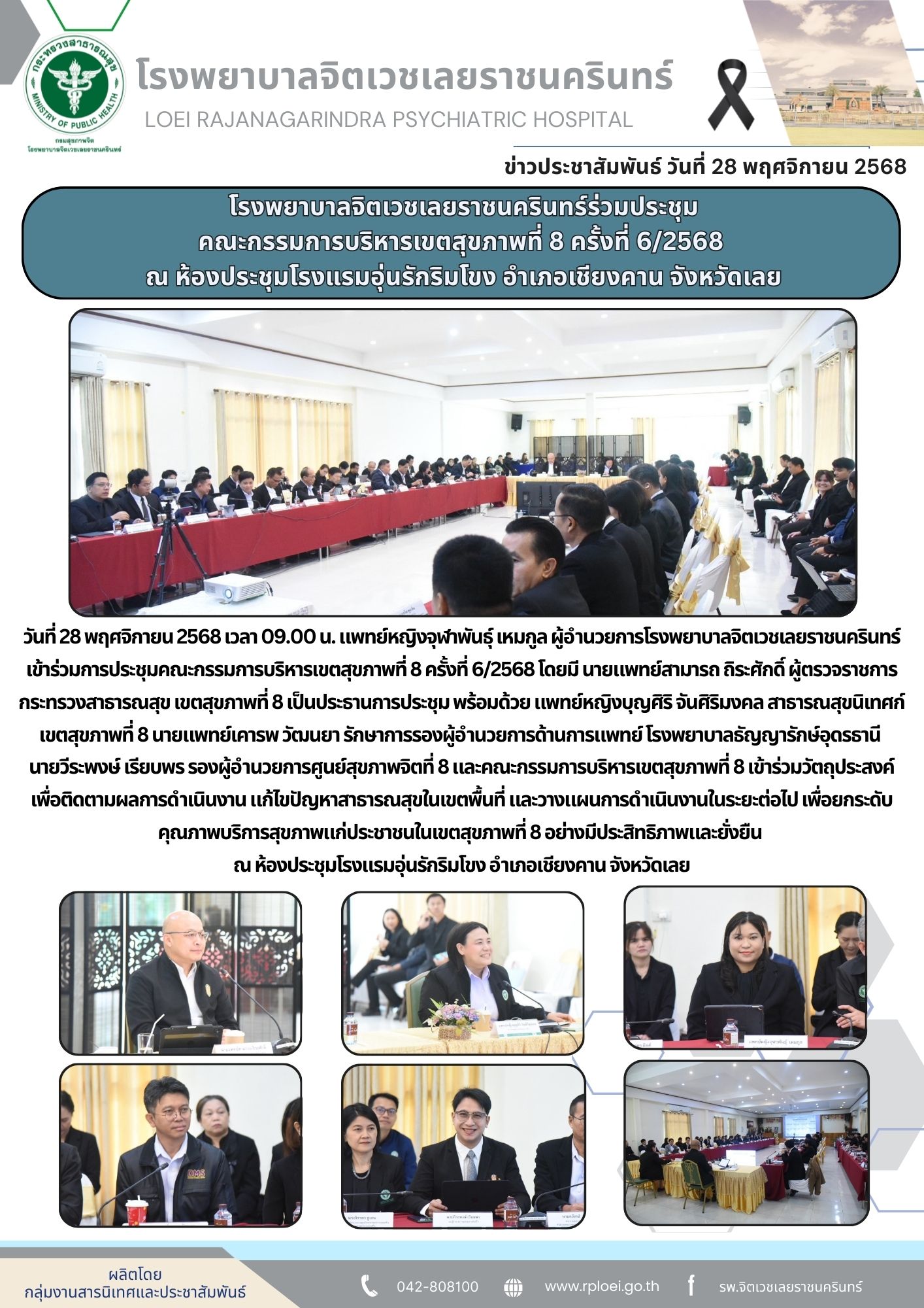 วันที่ 28 พฤศจิกายน 2568 เวลา 09.00 น. แพทย์หญิงจุฬาพันธุ์ เหมกูล ผู้อำนวยการโรงพยาบาลจิตเวชเลยราชนครินทร์ เข้าร่วมการประชุมคณะกรรมการบริหารเขตสุขภาพที่ 8 ครั้งที่ 6/2568 โดยมี นายแพทย์สามารถ ถิระศักดิ์ ผู้ตรวจราชการกระทรวงสาธารณสุข เขตสุขภาพที่ 8 เป็นประธานการประชุม พร้อมด้วย แพทย์หญิงบุญศิริ จันศิริมงคล สาธารณสุขนิเทศก์ เขตสุขภาพที่ 8 นายแพทย์เคารพ วัฒนยา รักษาการรองผู้อำนวยการด้านการแพทย์ โรงพยาบาลธัญญารักษ์อุดรธานี นายวีระพงษ์ เรียบพร รองผู้อำนวยการศูนย์สุขภาพจิตที่ 8 และคณะกรรมการบริหารเขตสุขภาพที่ 8 เข้าร่วมวัตถุประสงค์เพื่อติดตามผลการดำเนินงาน แก้ไขปัญหาสาธารณสุขในเขตพื้นที่ และวางแผนการดำเนินงานในระยะต่อไป เพื่อยกระดับคุณภาพบริการสุขภาพแก่ประชาชนในเขตสุขภาพที่ 8 อย่างมีประสิทธิภาพและยั่งยืน