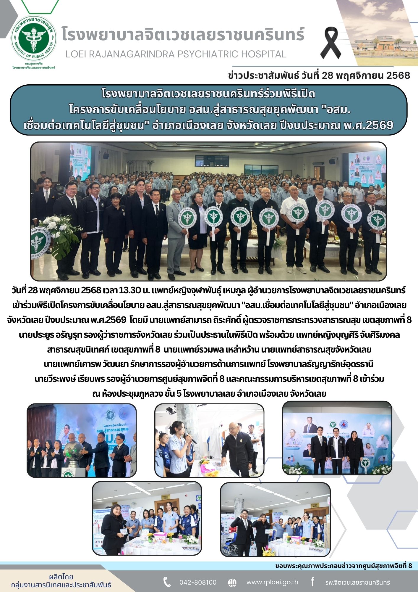 วันที่ 28 พฤศจิกายน 2568 เวลา 13.30 น. แพทย์หญิงจุฬาพันธุ์ เหมกูล ผู้อำนวยการโรงพยาบาลจิตเวชเลยราชนครินทร์ เข้าร่วมพิธีเปิดโครงการขับเคลื่อนโยบาย อสม.สู่สาธารณสุขยุคพัฒนา “อสม.เชื่อมต่อเทคโนโลยีสู่ชุมชน” อำเภอเมืองเลย จังหวัดเลย ปีงบประมาณ พ.ศ.2569 โดยมี นายแพทย์สามารถ ถิระศักดิ์ ผู้ตรวจราชการกระทรวงสาธารณสุข เขตสุขภาพที่ 8 นายประยูร อรัญรุท รองผู้ว่าราชการจังหวัดเลย ร่วมเป็นประธานในพิธีเปิด พร้อมด้วย แพทย์หญิงบุญศิริ จันศิริมงคล สาธารณสุขนิเทศก์ เขตสุขภาพที่ 8 นายแพทย์รวมพล เหล่าหว้าน นายแพทย์สาธารณสุขจังหวัดเลย นายแพทย์เคารพ วัฒนยา รักษาการรองผู้อำนวยการด้านการแพทย์ โรงพยาบาลธัญญารักษ์อุดรธานี นายวีระพงษ์ เรียบพร รองผู้อำนวยการศูนย์สุขภาพจิตที่ 8 และคณะกรรมการบริหารเขตสุขภาพที่ 8 เข้าร่วม ณ ห้องประชุมภูหลวง ชั้น 5 โรงพยาบาลเลย อำเภอเมืองเลย จังหวัดเลย