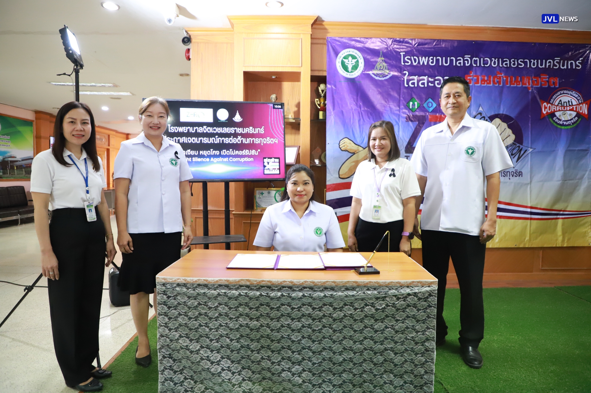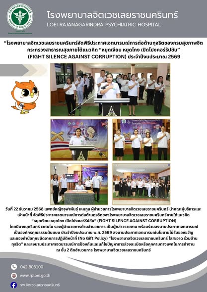 วันที่ 22 ธันวาคม 2568 แพทย์หญิงจุฬาพันธุ์ เหมกูล ผู้อำนวยการโรงพยาบาลจิตเวชเลยราชนครินทร์ นำคณะผู้บริหารและเจ้าหน้าที่ จัดพิธีประกาศเจตนารมณ์การต่อต้านทุจริตของโรงพยาบาลจิตเวชเลยราชนครินทร์ภายใต้แนวคิด“หยุดเงียบ หยุดโกง เปิดโปงคอร์รัปชัน” (FIGHT SILENCE AGAINST CORRUPTION) โดยมีนางบุศรินทร์ เวศมโน รองผู้อำนวยการด้านอำนวยการ เป็นผู้กล่าวรายงาน พร้อมร่วมลงนามประกาศเจตนารมณ์เป็นองค์กรคุณธรรมต้นแบบ ประจำปีงบประมาณ พ.ศ. 2569 ลงนามประกาศเจตนารมณ์นโยบายไม่รับของขวัญและของกำนัลทุกชนิดจากการปฏิบัติหน้าที่ (No Gift Policy) “โรงพยาบาลจิตเวชเลยราชนครินทร์ ใสสะอาด ร่วมต้านทุจริต” และลงนามประกาศเจตนารมณ์การป้องกันและแก้ไขปัญหาการล่วงละเมิดหรือคุกคามทางเพศในการทำงาน ณ ชั้น 2 ตึกอำนวยการ โรงพยาบาลจิตเวชเลยราชนครินทร์