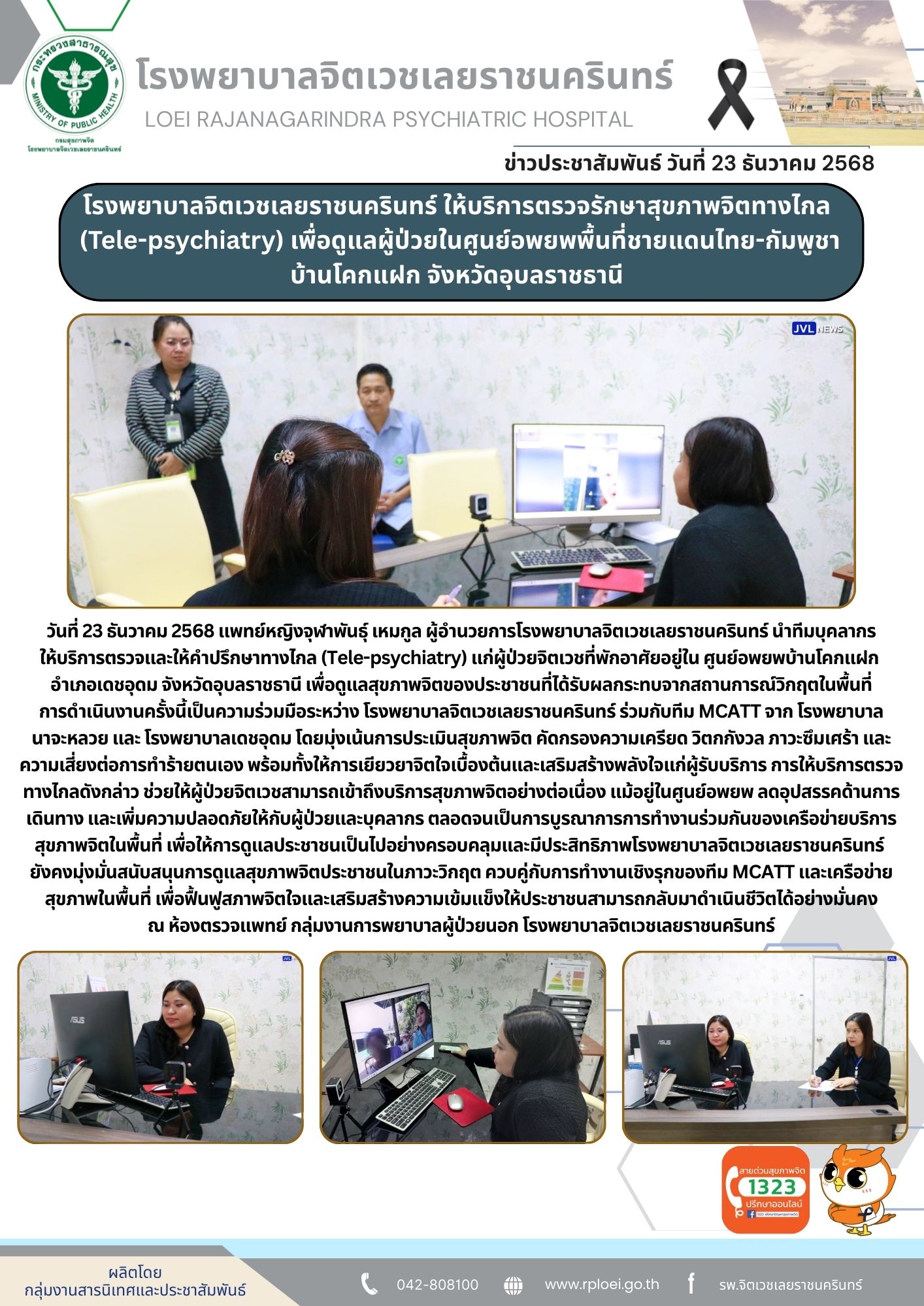 วันที่ 23 ธันวาคม 2568 แพทย์หญิงจุฬาพันธ์ุ เหมกูล ผู้อำนวยการโรงพยาบาลจิตเวชเลยราชนครินทร์ นำทีมบุคลากรให้บริการตรวจและให้คำปรึกษาทางไกล (Tele-psychiatry) แก่ผู้ป่วยจิตเวชที่พักอาศัยอยู่ใน ศูนย์อพยพบ้านโคกแฝก อำเภอเดชอุดม จังหวัดอุบลราชธานี เพื่อดูแลสุขภาพจิตของประชาชนที่ได้รับผลกระทบจากสถานการณ์วิกฤตในพื้นที่การดำเนินงานครั้งนี้เป็นความร่วมมือระหว่าง โรงพยาบาลจิตเวชเลยราชนครินทร์ ร่วมกับทีม MCATT จาก โรงพยาบาลนาจะหลวย และ โรงพยาบาลเดชอุดม โดยมุ่งเน้นการประเมินสุขภาพจิต คัดกรองความเครียด วิตกกังวล ภาวะซึมเศร้า และความเสี่ยงต่อการทำร้ายตนเอง พร้อมทั้งให้การเยียวยาจิตใจเบื้องต้นและเสริมสร้างพลังใจแก่ผู้รับบริการ การให้บริการตรวจทางไกลดังกล่าว ช่วยให้ผู้ป่วยจิตเวชสามารถเข้าถึงบริการสุขภาพจิตอย่างต่อเนื่อง แม้อยู่ในศูนย์อพยพ ลดอุปสรรคด้านการเดินทาง และเพิ่มความปลอดภัยให้กับผู้ป่วยและบุคลากร ตลอดจนเป็นการบูรณาการการทำงานร่วมกันของเครือข่ายบริการสุขภาพจิตในพื้นที่ เพื่อให้การดูแลประชาชนเป็นไปอย่างครอบคลุมและมีประสิทธิภาพโรงพยาบาลจิตเวชเลยราชนครินทร์ ยังคงมุ่งมั่นสนับสนุนการดูแลสุขภาพจิตประชาชนในภาวะวิกฤต ควบคู่กับการทำงานเชิงรุกของทีม MCATT และเครือข่ายสุขภาพในพื้นที่ เพื่อฟื้นฟูสภาพจิตใจและเสริมสร้างความเข้มแข็งให้ประชาชนสามารถกลับมาดำเนินชีวิตได้อย่างมั่นคง ณ ห้องตรวจแพทย์ กลุ่มงานการพยาบาลผู้ป่วยนอก โรงพยาบาลจิตเวชเลยราชนครินทร์