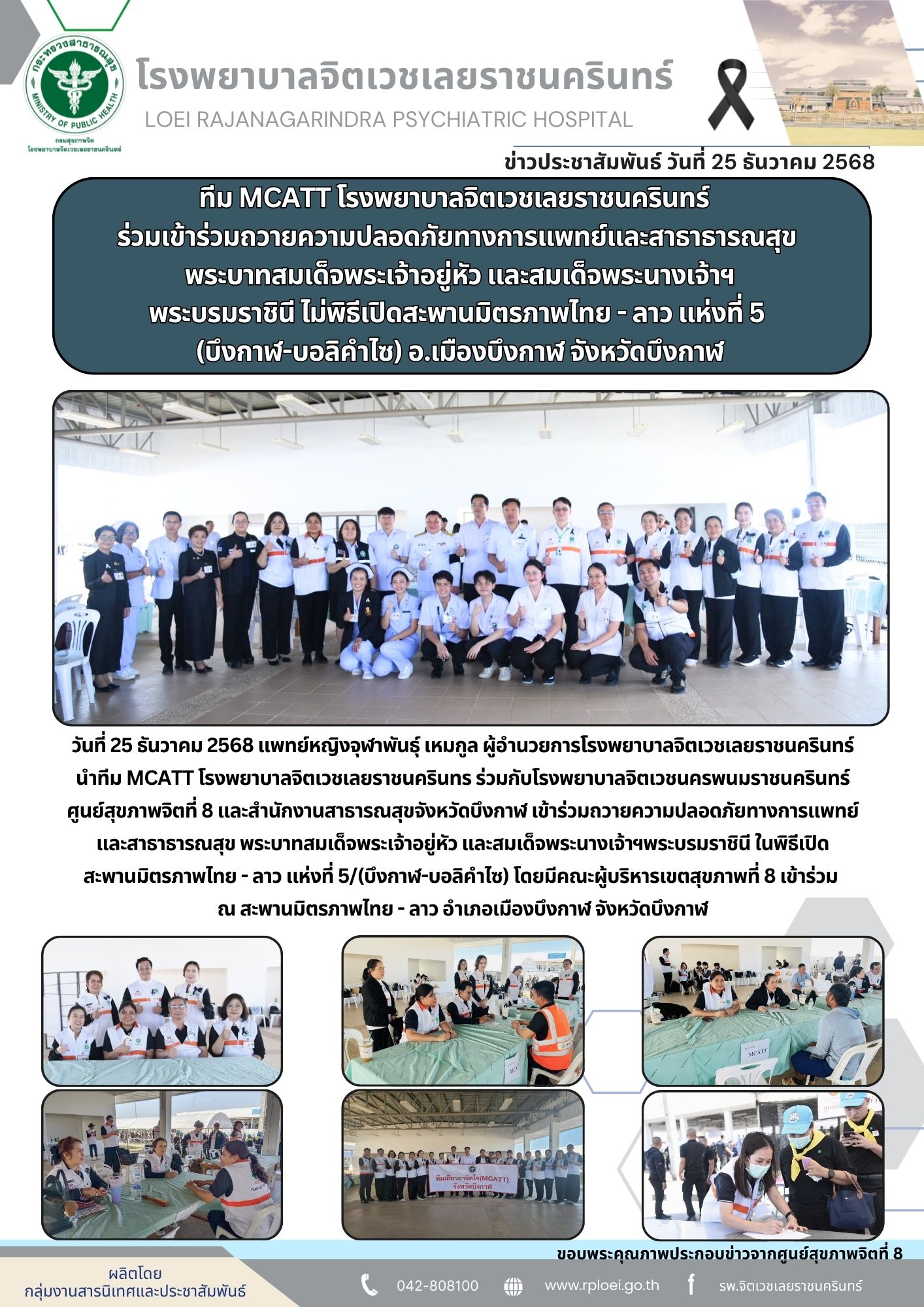 วันที่ 25 ธันวาคม 2568 แพทย์หญิงจุฬาพันธุ์ เหมกูล ผู้อำนวยการโรงพยาบาลจิตเวชเลยราชนครินทร์นำทีม MCATT โรงพยาบาลจิตเวชเลยราชนครินทร ร่วมกับโรงพยาบาลจิตเวชนครพนมราชนครินทร์ ศูนย์สุขภาพจิตที่ 8 และสำนักงานสาธารณสุขจังหวัดบึงกาฬ เข้าร่วมถวายความปลอดภัยทางการแพทย์และสาธาธารณสุข พระบาทสมเด็จพระเจ้าอยู่หัว และสมเด็จพระนางเจ้าฯพระบรมราชินี ในพิธีเปิดสะพานมิตรภาพไทย – ลาว แห่งที่ 5/(บึงกาฬ-บอลิคำไซ) โดยมีคณะผู้บริหารเขตสุขภาพที่ 8 เข้าร่วม ณ สะพานมิตรภาพไทย – ลาว อำเภอเมืองบึงกาฬ จังหวัดบึงกาฬ ขอบพระคุณภาพประกอบข่าวจากศูนย์สุขภาพจิตที่ 8
