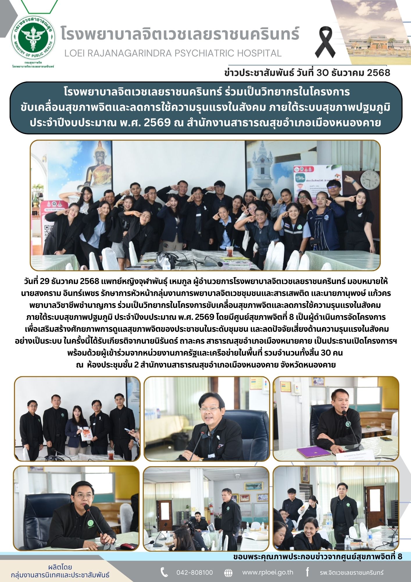 วันที่ 29 ธันวาคม 2568 แพทย์หญิงจุฬาพันธ์ุ เหมกูล ผู้อำนวยการโรงพยาบาลจิตเวชเลยราชนครินทร์ มอบหมายให้ นายสงคราม อินทร์เพชร รักษาการหัวหน้ากลุ่มงานการพยาบาลจิตเวชชุมชนและสารเสพติด และนายภานุพงษ์ แก้วคร พยาบาลวิชาชีพชำนาญการ ร่วมเป็นวิทยากรในโครงการขับเคลื่อนสุขภาพจิตและลดการใช้ความรุนแรงในสังคม ภายใต้ระบบสุขภาพปฐมภูมิ ประจำปีงบประมาณ พ.ศ. 2569 โดยมีศูนย์สุขภาพจิตที่ 8 เป็นผู้ดำเนินการจัดโครงการ เพื่อเสริมสร้างศักยภาพการดูแลสุขภาพจิตของประชาชนในระดับชุมชน และลดปัจจัยเสี่ยงด้านความรุนแรงในสังคม อย่างเป็นระบบ ในครั้งนี้ได้รับเกียรติจากนายนิรันดร์ ถาละคร สาธารณสุขอำเภอเมืองหนายคาย เป็นประธานเปิดโครงการฯ พร้อมด้วยผู้เข้าร่วมจากหน่วยงานภาครัฐและเครือข่ายในพื้นที่ รวมจำนวนทั้งสิ้น 30 คน ณ ห้องประชุมชั้น 2 สำนักงานสาธารณสุขอำเภอเมืองหนองคาย จังหวัดหนองคาย ขอบพระคุณภาพและเนื้อหาข่าวจากศูนย์สุขภาพจิตที่ 8