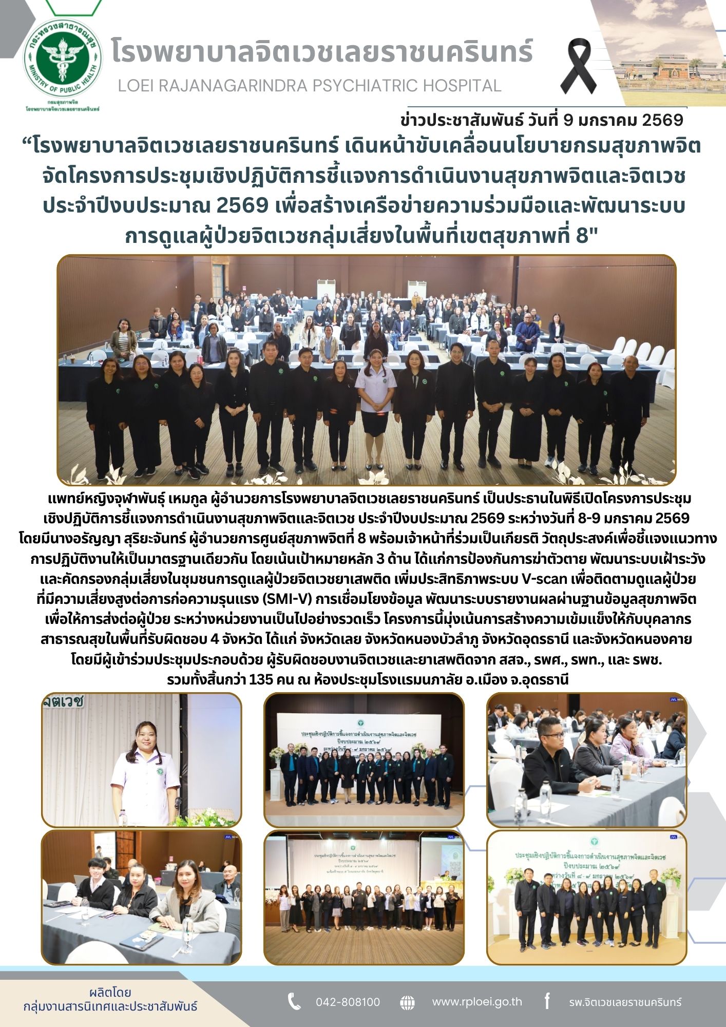 แพทย์หญิงจุฬาพันธ์ุ เหมกูล ผู้อำนวยการโรงพยาบาลจิตเวชเลยราชนครินทร์ เป็นประธานในพิธีเปิดโครงการประชุมเชิงปฏิบัติการชี้แจงการดำเนินงานสุขภาพจิตและจิตเวช ประจำปีงบประมาณ 2569 ระหว่างวันที่ 8-9 มกราคม 2569 โดยมีนางอรัญญา สุริยะจันทร์ ผู้อำนวยการศูนย์สุขภาพจิตที่ 8 พร้อมเจ้าหน้าที่ร่วมเป็นเกียรติ วัตถุประสงค์เพื่อชี้แจงแนวทางการปฏิบัติงานให้เป็นมาตรฐานเดียวกัน โดยเน้นเป้าหมายหลัก 3 ด้าน ได้แก่การป้องกันการฆ่าตัวตาย พัฒนาระบบเฝ้าระวังและคัดกรองกลุ่มเสี่ยงในชุมชนการดูแลผู้ป่วยจิตเวชยาเสพติด เพิ่มประสิทธิภาพระบบ V-scan เพื่อติดตามดูแลผู้ป่วยที่มีความเสี่ยงสูงต่อการก่อความรุนแรง (SMI-V) การเชื่อมโยงข้อมูล พัฒนาระบบรายงานผลผ่านฐานข้อมูลสุขภาพจิต เพื่อให้การส่งต่อผู้ป่วย ระหว่างหน่วยงานเป็นไปอย่างรวดเร็ว โครงการนี้มุ่งเน้นการสร้างความเข้มแข็งให้กับบุคลากรสาธารณสุขในพื้นที่รับผิดชอบ 4 จังหวัด ได้แก่ จังหวัดเลย จังหวัดหนองบัวลำภู จังหวัดอุดรธานี และจังหวัดหนองคาย โดยมีผู้เข้าร่วมประชุมประกอบด้วย ผู้รับผิดชอบงานจิตเวชและยาเสพติดจาก สสจ., รพศ., รพท., และ รพช. รวมทั้งสิ้นกว่า 135 คน ณ ห้องประชุมโรงแรมนภาลัย อ.เมือง จ.อุดรธานี
