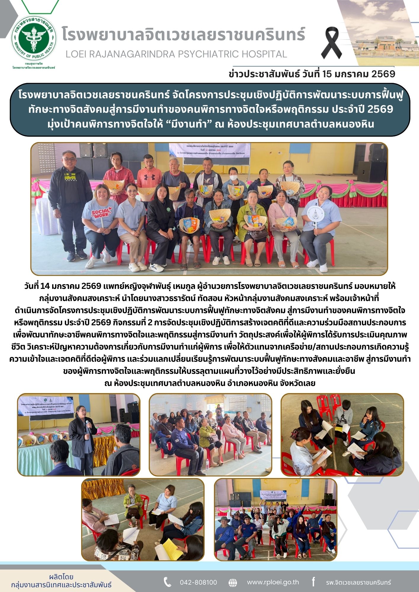 วันที่ 14 มกราคม 2569 แพทย์หญิงจุฬาพันธ์ุ เหมกูล ผู้อำนวยการโรงพยาบาลจิตเวชเลยราชนครินทร์ มอบหมายให้กลุ่มงานสังคมสงเคราะห์ นำโดยนางสาวธรารัตน์ ทัดสอน หัวหน้ากลุ่มงานสังคมสงเคราะห์ พร้อมเจ้าหน้าที่ ดำเนินการจัดโครงการประชุมเชิงปฏิบัติการพัฒนาระบบการฟื้นฟูทักษะทางจิตสังคม สู่การมีงานทำของคนพิการทางจิตใจหรือพฤติกรรม ประจำปี 2569 กิจกรรมที่ 2 การจัดประชุมเชิงปฏิบัติการสร้างเจตคติที่ดีและความร่วมมือสถานประกอบการเพื่อพัฒนาทักษะอาชีพคนพิการทางจิตใจและพฤติกรรมสู่การมีงานทำ วัตถุประสงค์เพื่อให้ผู้พิการได้รับการประเมินคุณภาพชีวิต วิเคราะห์ปัญหาความต้องการเกี่ยวกับการมีงานทำแก่ผู้พิการ เพื่อให้ตัวแทนจากเครือข่าย/สถานประกอบการเกิดความรู้ความเข้าใจและเจตคติที่ดีต่อผู้พิการ และร่วมแลกเปลี่ยนเรียนรู้การพัฒนาระบบฟื้นฟูทักษะทางสังคมและอาชีพ สู่การมีงานทำของผู้พิการทางจิตใจและพฤติกรรมให้บรรลุตามแผนที่วางไว้อย่างมีประสิทธิภาพและยั่งยืน ณ ห้องประชุมเทศบาลตำบลหนองหิน อำเภอหนองหิน จังหวัดเลย