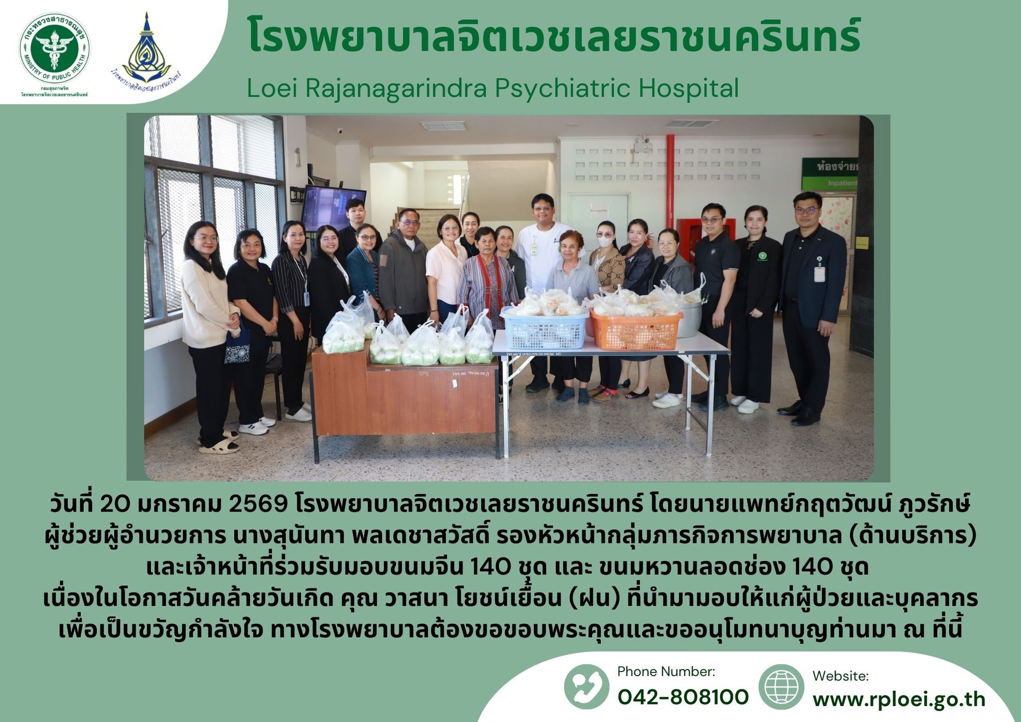 โรงพยาบาลจิตเวชเลยราชนครินทร์ รับมอบขนมจีน 140 ชุด และ ขนมหวานลอดช่อง 140 ชุด เนื่องในโอกาสวันคล้ายวันเกิด คุณ. มกราคม 21, 2026มกราคม 21, 2026ภาสกร นวลจันทร์ข่าวประชาสัมพันธ์ จำนวนผู้เข้าชม : 7