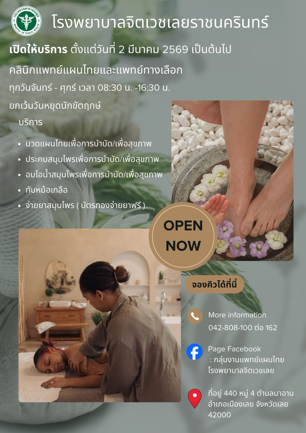 โรงพยาบาลจิตเวชเลยราชนครินทร์ เปิดให้บริการคลินิกแพทย์แผนไทยและแพทย์ทางเลือก ตั้งแต่วันที่ 2 มีนาคม 2569 เป็นต้นไป รายละเอียดตาม Poster ด้านล่างนี้ หรือโทรศัพท์สอบถามได้ที่เบอร์ 042-808162 กุมภาพันธ์ 13, 2026กุมภาพันธ์ 13, 2026ภาสกร นวลจันทร์ข่าวประชาสัมพันธ์ โรงพยาบาลจิตเวชเลยราชนครินทร์ เปิดให้บริการคลินิกแพทย์แผนไทยและแพทย์ทางเลือก ตั้งแต่วันที่ 2 มีนาคม 2569 เป็นต้นไป รายละเอียดตาม Poster ด้านล่างนี้ หรือโทรศัพท์สอบถามได้ที่เบอร์ 042-808162 จำนวนผู้เข้าชม : 2