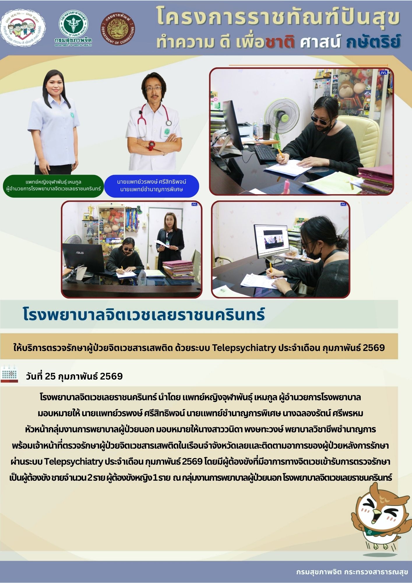 โรงพยาบาลจิตเวชเลยราชนครินทร์ นำโดย แพทย์หญิงจุฬาพันธุ์ เหมกูล ผู้อำนวยการโรงพยาบาลมอบหมายให้ นายแพทย์วรพงษ์ ศรีสิทธิพจน์ นายแพทย์ชำนาญการพิเศษ นางฉลองรัตน์ ศรีพรหม หัวหน้ากลุ่มงานการพยาบาลผู้ป่วยนอก มอบหมายให้นางสาววนิดา พงษทะวงษ์ พยาบาลวิชาชีพชำนาญการพร้อมเจ้าหน้าที่ตรวจรักษาผู้ป่วยจิตเวชสารเสพติดในเรือนจำจังหวัดเลยและติดตามอาการของผู้ป่วยหลังการรักษาผ่านระบบ Telepsychiatry ประจำเดือน กุมภาพันธ์ 2569 โดยมีผู้ต้องขังที่มีอาการทางจิตเวชเข้ารับการตรวจรักษาเป็นผู้ต้องขัง ชายจำนวน 2 ราย ผู้ต้องขังหญิง 1 ราย ณ กลุ่มงานการพยาบาลผู้ป่วยนอก โรงพยาบาลจิตเวชเลยราชนครินทร์