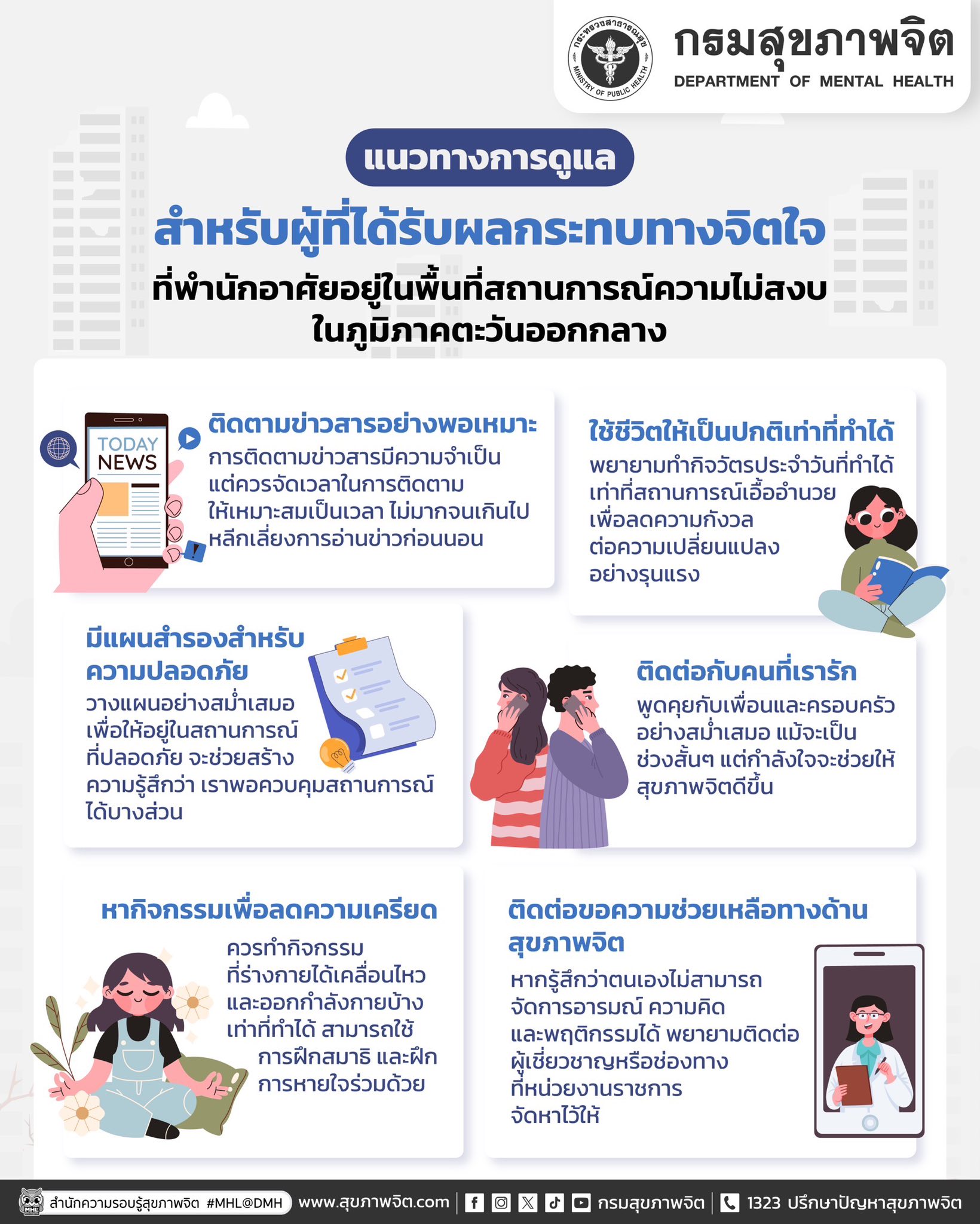 ส่งต่อความห่วงใย… แนวทางการดูแลใจสำหรับผู้ที่อยู่ในสถานการณ์ความไม่สงบ ในสภาวะที่ต้องเผชิญกับสถานการณ์ความไม่สงบในภูมิภาคตะวันออกกลาง กรมสุขภาพจิตขอส่งกำลังใจและแนวทางในการดูแลจิตใจ เพื่อให้คุณและคนที่คุณรักก้าวผ่านช่วงเวลาที่ยากลำบากนี้ไปได้อย่างเข้มแข็งครับ