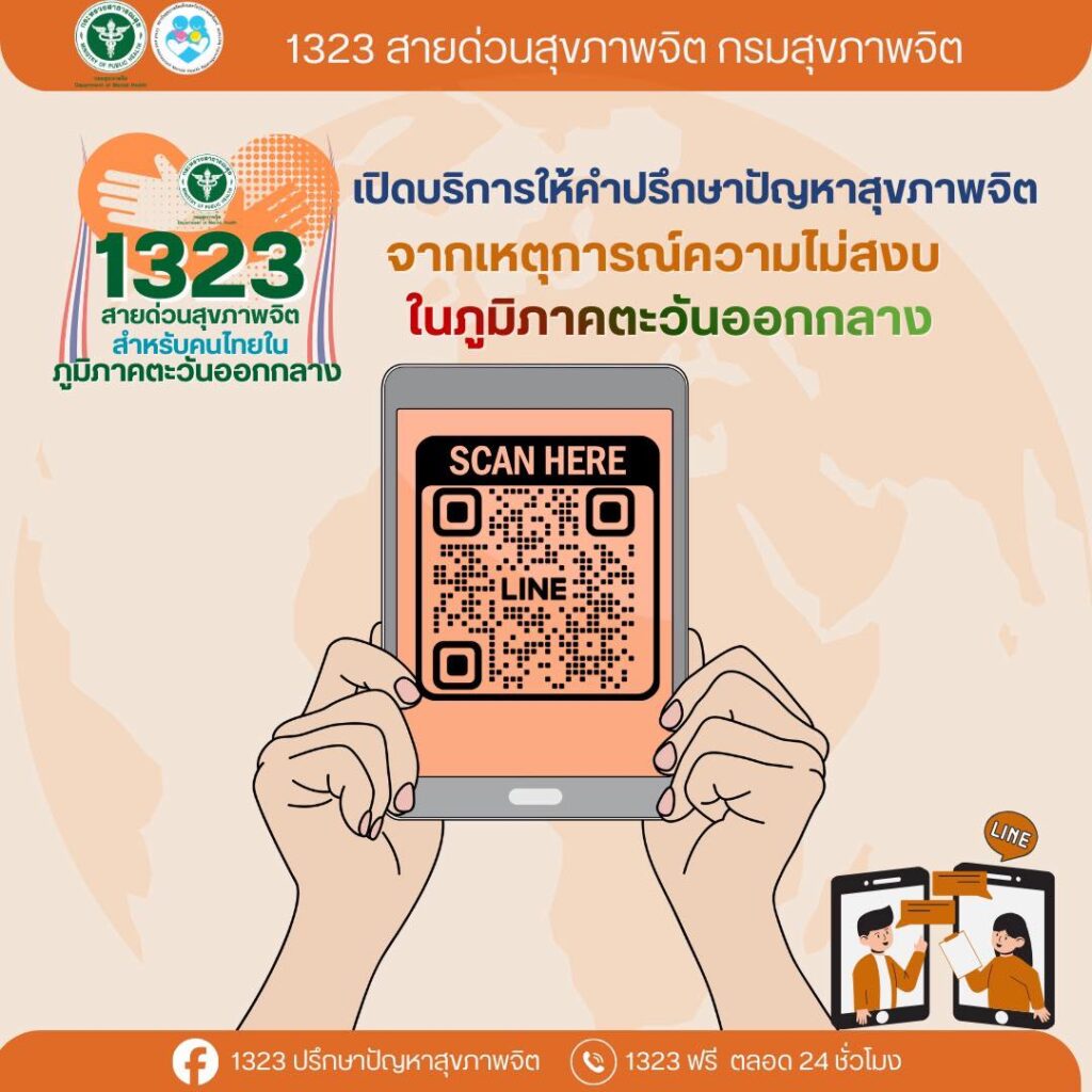ช่องทางการขอรับคำปรึกษาปัญหาสุขภาพจิต เพื่อช่วยบรรเทาความเครียดและความวิตกกังวล จากสถานการณ์ความไม่สงบที่เกิดขึ้น มีนาคม 5, 2026ภาสกร นวลจันทร์ข่าวประชาสัมพันธ์, ภาพกิจกรรม/โครงการ, อินโฟกราฟฟิก จากสถานการณ์ความไม่สงบที่เกิดขึ้น ส่งผลกระทบต่อสภาพจิตใจของพี่น้องชาวไทยและครอบครัว กรมสุขภาพจิตจึงขอเน้นย้ำช่องทางการขอรับคำปรึกษาปัญหาสุขภาพจิต เพื่อช่วยบรรเทาความเครียดและความวิตกกังวล ดังนี้ . สายด่วนสุขภาพจิต 1323 โทรฟรี ปรึกษาได้ตลอด 24 ชั่วโมง LINE Official สแกนได้ที่ภาพด้านล่างเพื่อแชทกับเจ้าหน้าที่ . #สายด่วน1323 #กรมสุขภาพจิต #ความไม่สงบตะวันออกกลาง #ให้คำปรึกษาสุขภาพจิต จำนวนผู้เข้าชม : 2