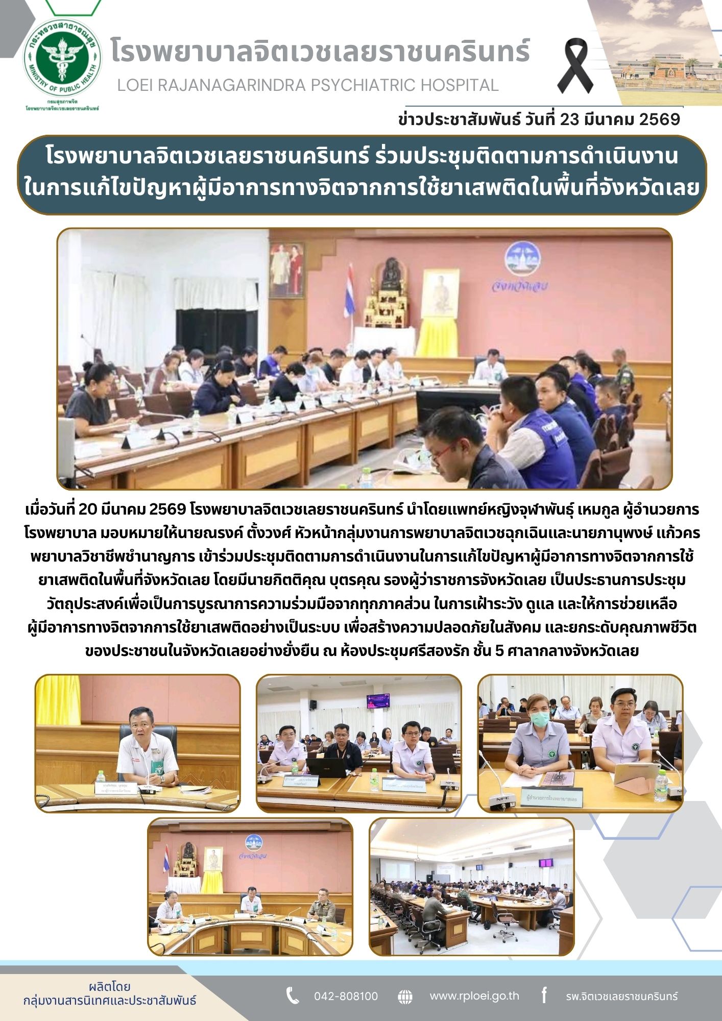 เมื่อวันที่ 20 มีนาคม 2569 โรงพยาบาลจิตเวชเลยราชนครินทร์ นำโดยแพทย์หญิงจุฬาพันธุ์ เหมกูล ผู้อำนวยการโรงพยาบาล มอบหมายให้นายณรงค์ ตั้งวงศ์ หัวหน้ากลุ่มงานการพยาบาลจิตเวชฉุกเฉินและนายภานุพงษ์ แก้วคร พยาบาลวิชาชีพชำนาญการ เข้าร่วมประชุมติดตามการดำเนินงานในการแก้ไขปัญหาผู้มีอาการทางจิตจากการใช้ยาเสพติดในพื้นที่จังหวัดเลย โดยมีนายกิตติคุณ บุตรคุณ รองผู้ว่าราชการจังหวัดเลย เป็นประธานการประชุม วัตถุประสงค์เพื่อเป็นการบูรณาการความร่วมมือจากทุกภาคส่วน ในการเฝ้าระวัง ดูแล และให้การช่วยเหลือผู้มีอาการทางจิตจากการใช้ยาเสพติดอย่างเป็นระบบ เพื่อสร้างความปลอดภัยในสังคม และยกระดับคุณภาพชีวิตของประชาชนในจังหวัดเลยอย่างยั่งยืน ณ ห้องประชุมศรีสองรัก ชั้น 5 ศาลากลางจังหวัดเลย