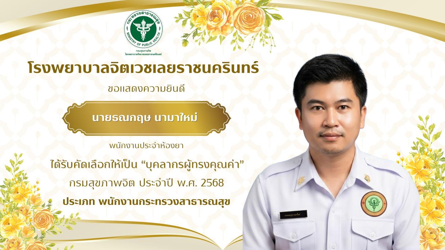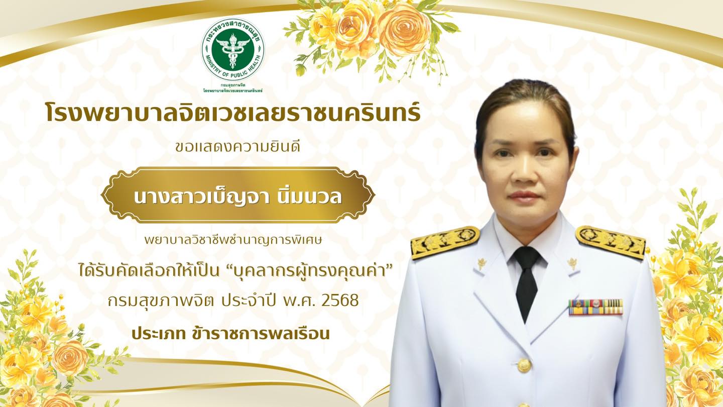 โรงพยาบาลจิตเวชเลยราชนครินทร์ ขอแสดงความยินดีกับบุคลากร ที่ได้รับการคัดเลือกเป็น “บุคลากรผู้ทรงคุณค่า” กรมสุขภาพจิต ประจำปี 2568 ประเภท บุคคลต้นแบบในสายวิชาชีพ/สายสนับสนุน มีนาคม 30, 2026มีนาคม 30, 2026ภาสกร นวลจันทร์ข่าวประชาสัมพันธ์ โรงพยาบาลจิตเวชเลยราชนครินทร์ ขอแสดงความยินดีกับบุคลากร ที่ได้รับการคัดเลือกเป็น “บุคลากรผู้ทรงคุณค่า” กรมสุขภาพจิต ประจำปี 2568 ประเภท บุคคลต้นแบบในสายวิชาชีพ/สายสนับสนุน จำนวนผู้เข้าชม : 2