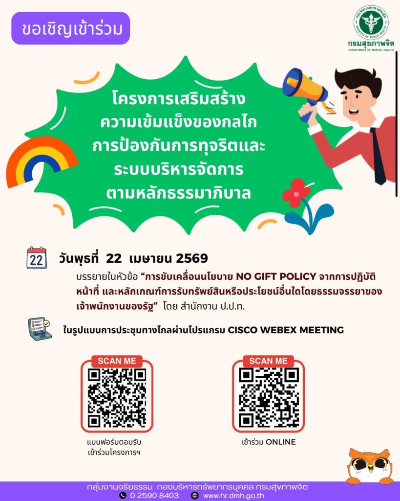 ขอเชิญเข้าร่วม โครงการเสริมสร้างความเข้มแข็งของกลไกการป้องกันการทุจริตและระบบบริหารจักการตามหลักธรรมมาภิบาล วันพุธที่ 22 เมษายน 2569 เมษายน 20, 2026เมษายน 20, 2026ภาสกร นวลจันทร์ข่าวประชาสัมพันธ์ ขอเชิญเข้าร่วม โครงการเสริมสร้างความเข้มแข็งของกลไกการป้องกันการทุจริตและระบบบริหารจักการตามหลักธรรมมาภิบาล จำนวนผู้เข้าชม : 2