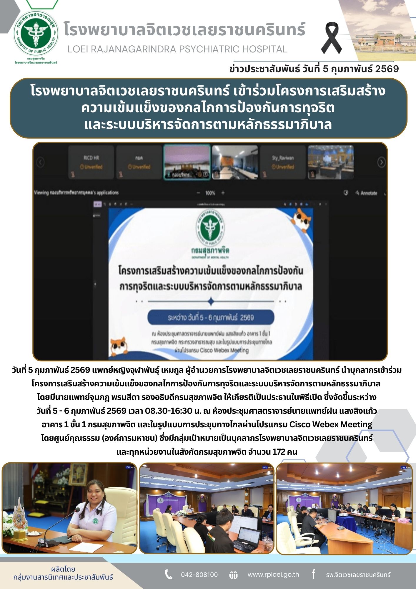 วันที่ 5 กุมภาพันธ์ 2569 แพทย์หญิงจุฬาพันธุ์ เหมกูล ผู้อำนวยการโรงพยาบาลจิตเวชเลยราชนครินทร์ นำบุคลากรเข้าร่วมโครงการเสริมสร้างความเข้มแข็งของกลไกการป้องกันการทุจริตและระบบบริหารจัดการตามหลักธรรมาภิบาล โดยมีนายแพทย์จุมภฏ พรมสีดา รองอธิบดีกรมสุขภาพจิต ให้เกียรติเป็นประธานในพิธีเปิด ซึ่งจัดขึ้นระหว่างวันที่ 5 – 6 กุมภาพันธ์ 2569 เวลา 08.30-16:30 น. ณ ห้องประชุมศาสตราจารย์นายแพทย์ฝน แสงสิงแก้วอาคาร 1 ชั้น 1 กรมสุขภาพจิต และในรูปแบบการประชุบทางไกลผ่านโปรแกรม Cisco Webex Meetingโดยศูนย์คุณธรรม (องค์การมหาชน) ซึ่งมีกลุ่มเป้าหมายเป็นบุคลากรโรงพยาบาลจิตเวชเลยราชนครินทร์ และทุกหน่วยงานในสังกัดกรมสุขภาพจิต จำนวน 172 คน