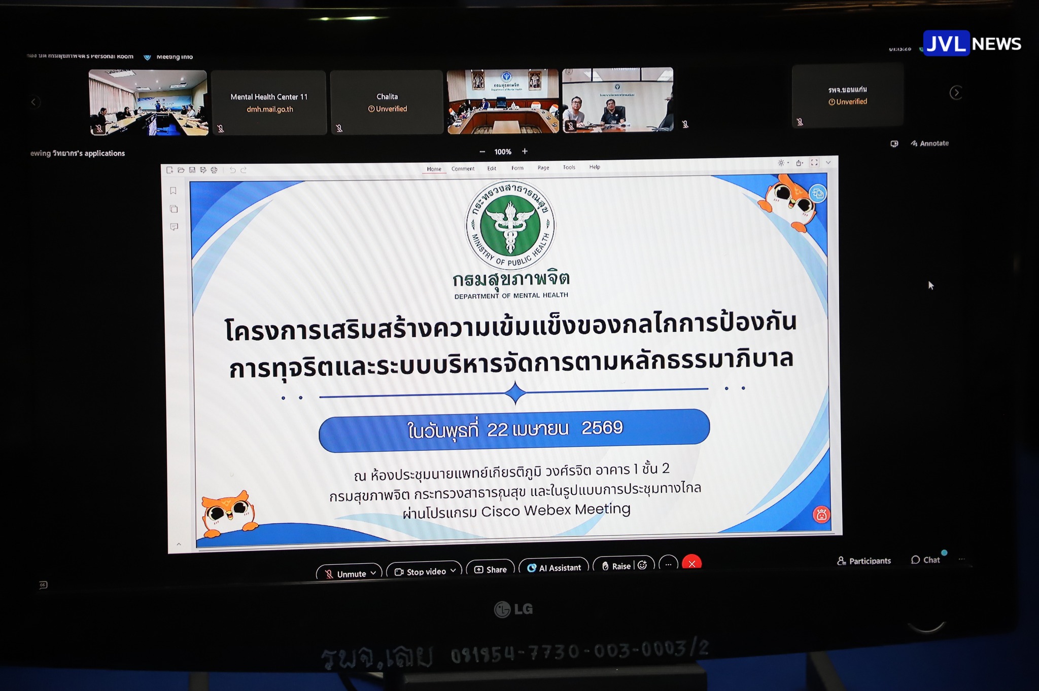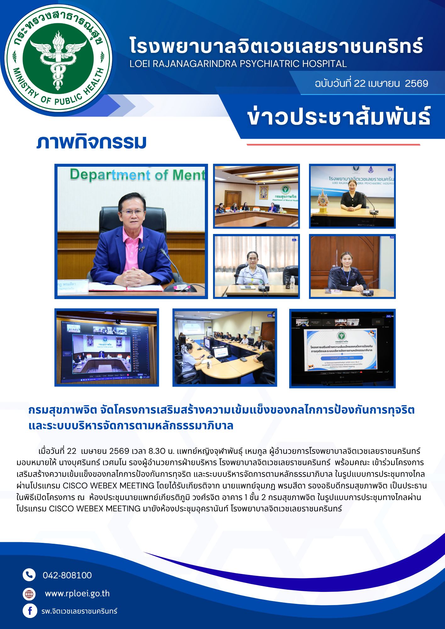 เมื่อวันที่ 22 เมษายน 2569 เวลา 8.30 น. เเพทย์หญิงจุฬาพันธุ์ เหมกูล ผู้อำนวยการโรงพยาบาลจิตเวชเลยราชนครินทร์มอบหมายให้ นางบุศรินทร์ เวศมโน รองผู้อำนวยการฝ่ายบริหาร โรงพยาบาลจิตเวชเลยราชนครินทร์ พร้อมคณะ เข้าร่วมโครงการเสริมสร้างความเข้มแข็งของกลไกการป้องกันการทุจริต และระบบบริหารจัดการตามหลักธรรมาภิบาล ในรูปแบบการประชุมทางไกลผ่านโปรแกรม Cisco Webex Meeting โดยได้รับเกียรติจาก นายแพทย์จุมภฏ พรมสีดา รองอธิบดีกรมสุขภาพจิต เป็นประธานในพิธีเปิดโครงการ ณ ห้องประชุมนายแพทย์เกียรติภูมิ วงศ์รจิต อาคาร 1 ชั้น 2 กรมสุขภาพจิต ในรูปแบบการประชุมทางไกลผ่านโปรแกรม Cisco Webex Meeting มายังห้องประอุครานันท์ โรงพยาบาลจิตเวชเลยราชนครินทร์