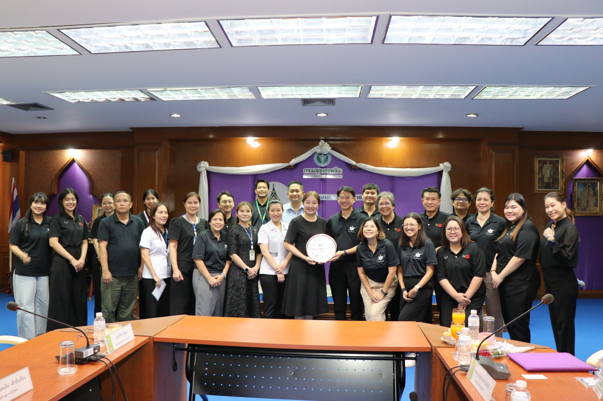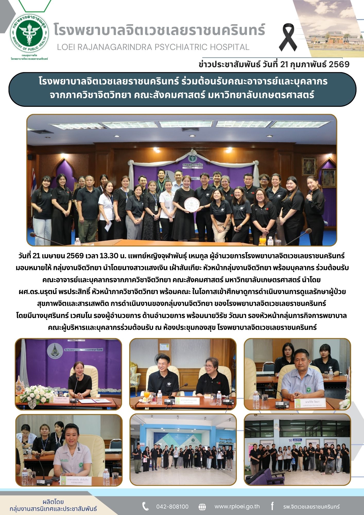 วันที่ 21 เมษายน 2569 เวลา 13.30 น. แพทย์หญิงจุฬาพันธ์ุ เหมกูล ผู้อำนวยการโรงพยาบาลจิตเวชเลยราชนครินทร์ มอบหมายให้ กลุ่มงานจิตวิทยา นำโดยนางสาวแสงเงิน เฝ้าสันเทียะ หัวหน้ากลุ่มงานจิตวิทยา พร้อมบุคลากร โรงพยาบาลจิตเวชเลยราชนครินทร์ ร่วมต้อนรับคณะอาจารย์และบุคลากรจากภาควิชาจิตวิทยา คณะสังคมศาสตร์ มหาวิทยาลับเกษตรศาสตร์ นำโดย ผศ.ดร.นรุตน์ พรประสิทธิ์ หัวหน้าภาควิชาจิตวิทยา พร้อมคณะ ในโอกาสเข้าศึกษาดูการดำเนินงานการดูแลรักษาผู้ป่วยสุขภาพจิตและสารเสพติด การดำเนินงานของกลุ่มงานจิตวิทยา ของโรงพยาบาลจิตเวชเลยราชนครินทร์ โดยมีนางบุศรินทร์ เวศมโน รองผู้อำนวยการ ด้านอำนวยการ พร้อมนายวิรัช วัฒนา รองหัวหน้ากลุ่มภารกิจการพยาบาล คณะผู้บริหารและบุคลากรร่วมต้อนรับ ณ ห้องประชุมกองสุข โรงพยาบาลจิตเวชเลยราชนครินทร์